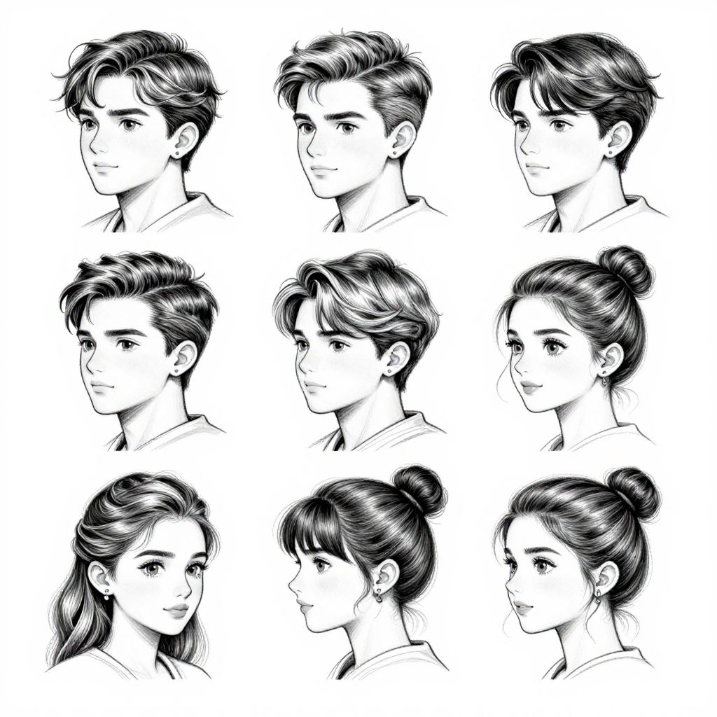 Hair style drawing reference displaying various men's and women's hair styles in a detailed black and white ink sketch style, highlighting different hair lengths, waves, and updos, arranged on a clean white background for artistic study purposes.