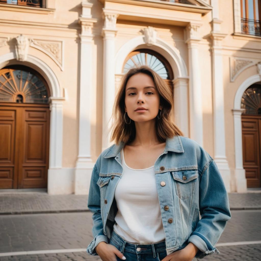 A young woman standing on an urban street in soft pastels and a calm mood, dressed in a casual denim jacket and white tank top, natural warm lighting, background showing classic European architecture in brown and beige color, subtle emotional expression, early morning