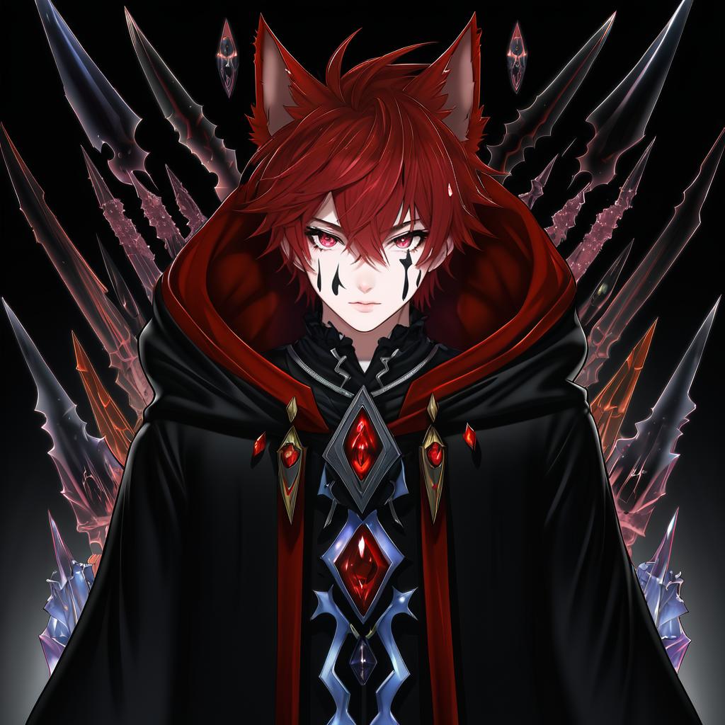 Crystal exarch, final fantasy, 1boy, cat boy, cat ears, red eyes, hair between eyes, slit pupils, red hair, short hair, hooded robe, black robe, hooded robe, black robe, hood down, miqo'te, material growth, facial mark, crystal, by artist wada kazu, anime