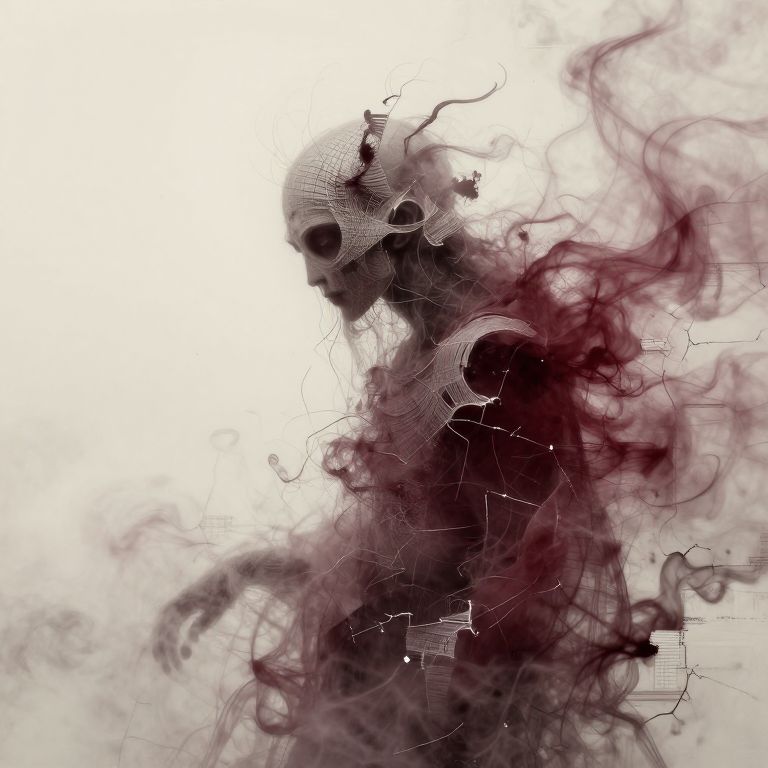 An ethereal ghostly figure is depicted in layered papier-mâché material, using creative light art, The style is abstracted realism, showing rough textures, minimalist forms, and muted colors in a stark composition, The image conveys raw emotional intensity and interplay of light and shadow, with sculpted textured layers and artistic lighting