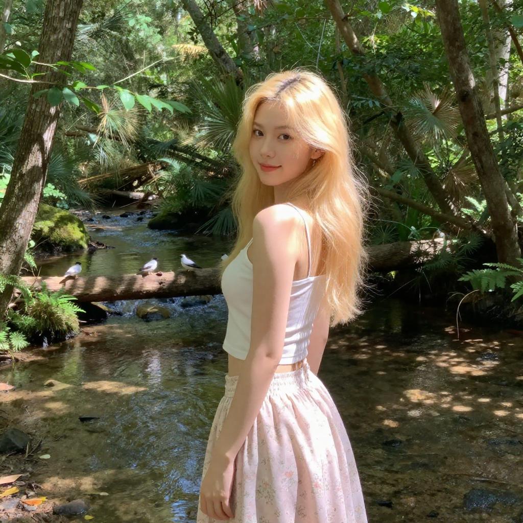 Photograph of a young woman with long, wavy blonde hair standing in a sunlit, wooded park. She wears a white, sleeveless, V-neck dress with a gathered skirt. Her hands are loosely clasped in front of her. The background features dense green foliage, a wooden bench, and a gravel path. Sunlight filters through the trees, casting dappled shadows on the ground.