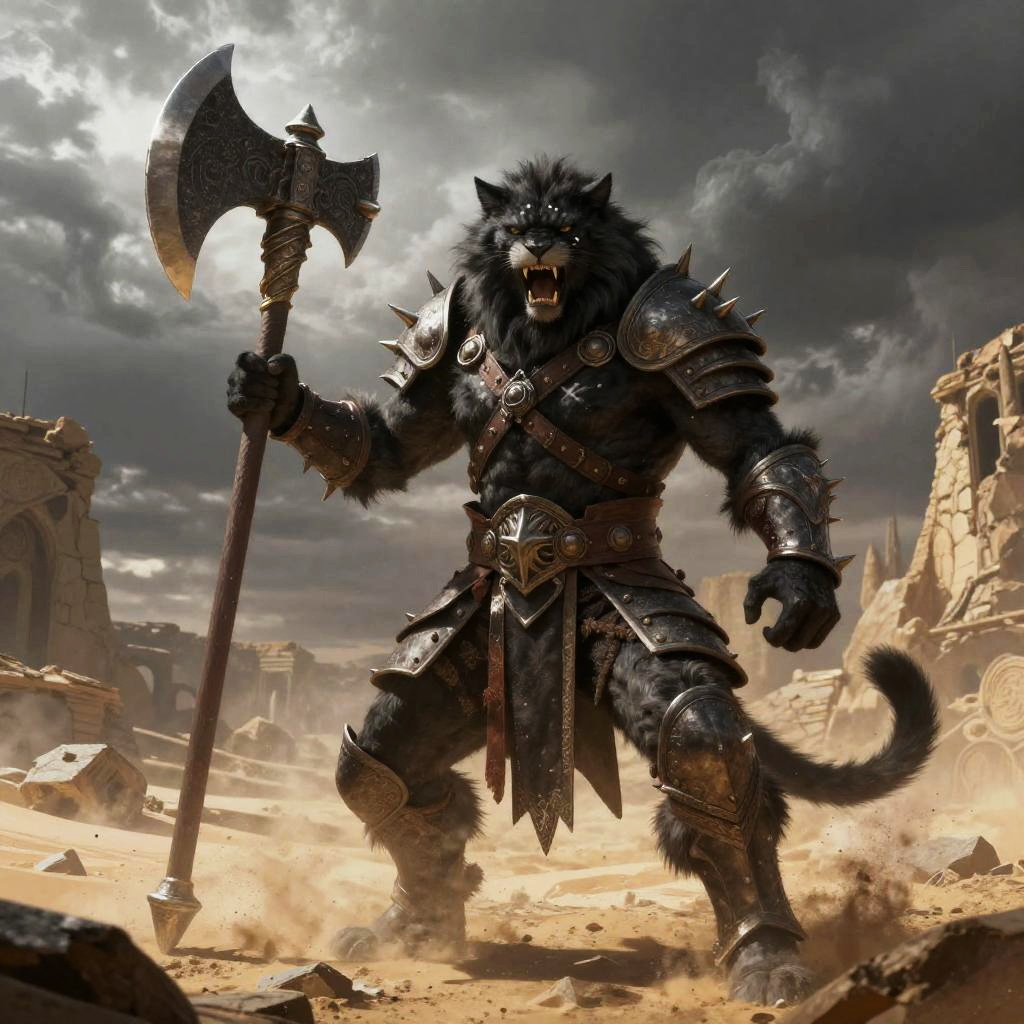 Black Leonin DND barbarian roaring in desert ruins, powerful dark furred feline figure, heavy spiked armor, war paint, holding giant battle axe, stormy sky, fantasy art style