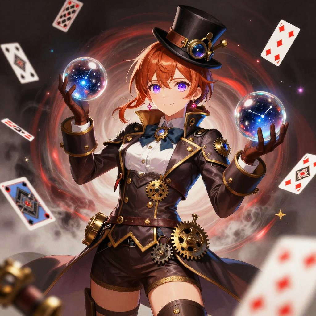 Anime style female character with copper hair and violet eyes, wearing a steampunk conductor's tailcoat with brass gears, leather straps, and a small top hat with goggles, holding glass orbs containing miniature constellations, surrounded by floating playing cards. The scene features a dynamic swirling smoky background with bright red and white highlights, intricate costume details, sharp expressive eyes, and an energetic and magical atmosphere. Rendered in high contrast and vibrant colors as detailed digital art.