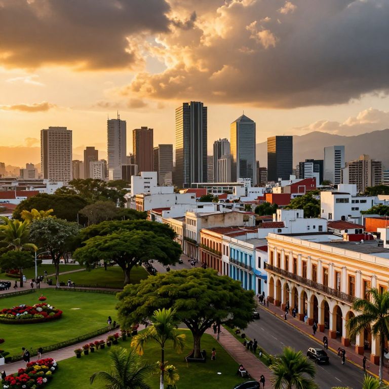 Photograph of a vibrant cityscape at sunset, featuring colorful colonial buildings, modern skyscrapers, lush green park, and dramatic clouds.