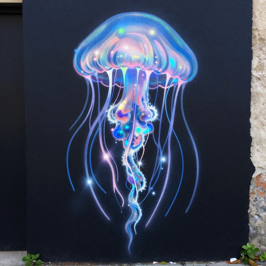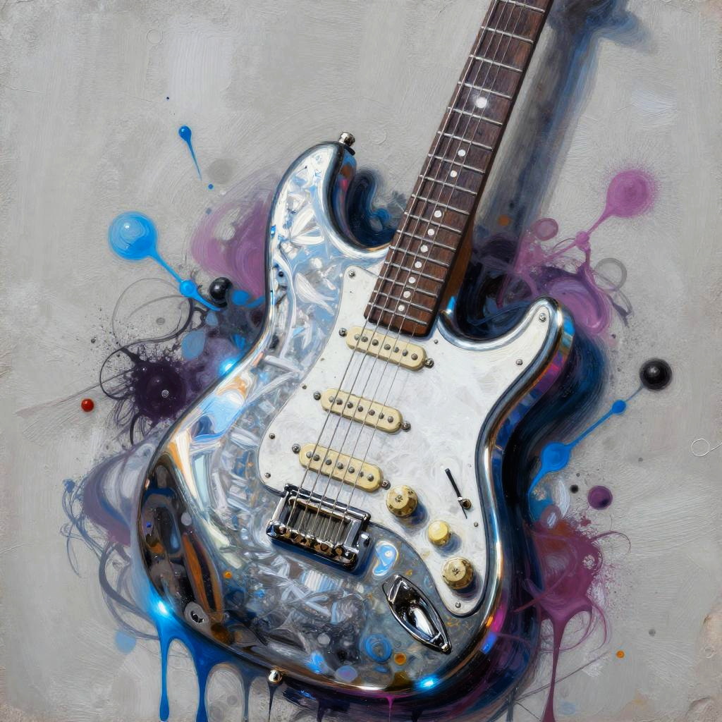 Electric Guitar graffiti art, splash art, street art, spray paint, oil gouache melting, acrylic, chrome silver with neon blue glows, ultra-detailed, ultra-quality, CGSociety