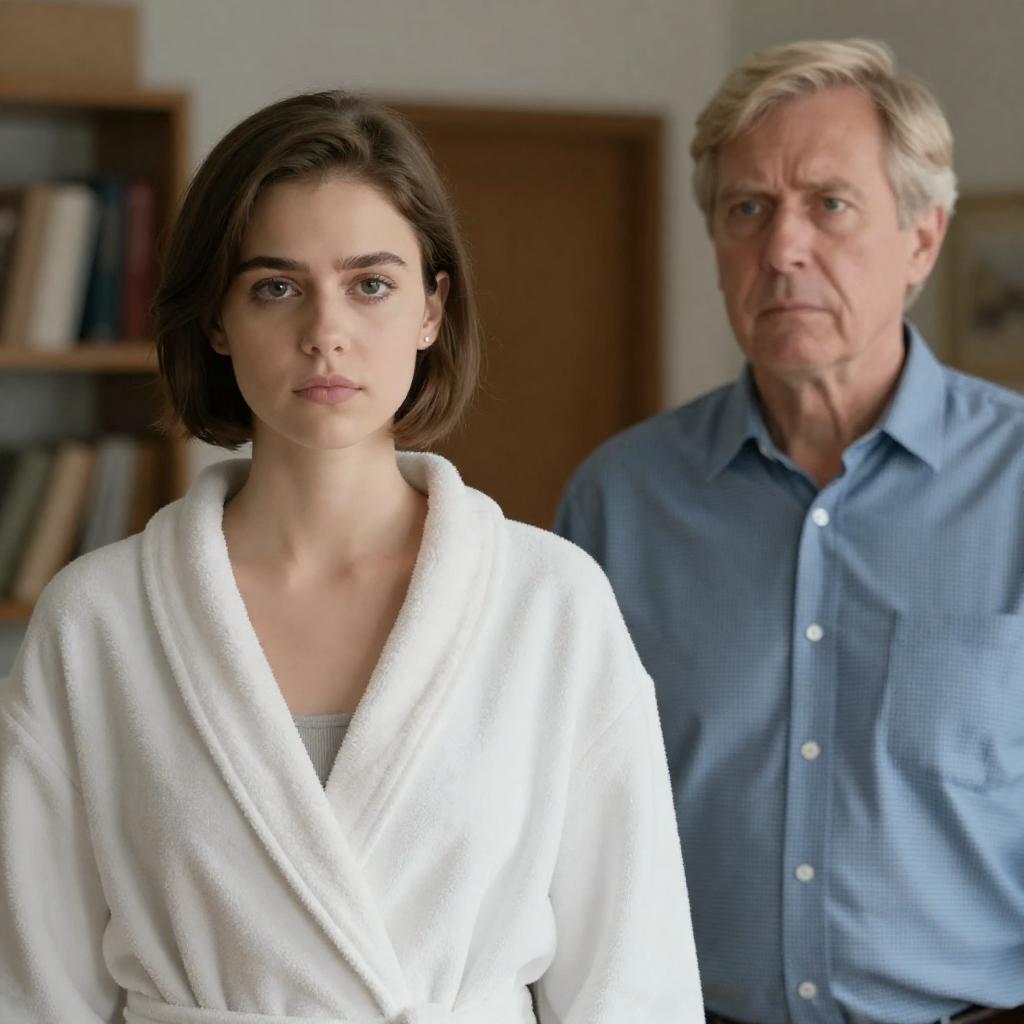 Man with gray hair in gray suit, white shirt, black shoes, sitting in wheelchair, holding cup, focused expression. Woman with brown hair in light blue dress, purple tights, standing, neutral expression. Room with car-patterned wallpaper, green carpet, large quilted bed in foreground.