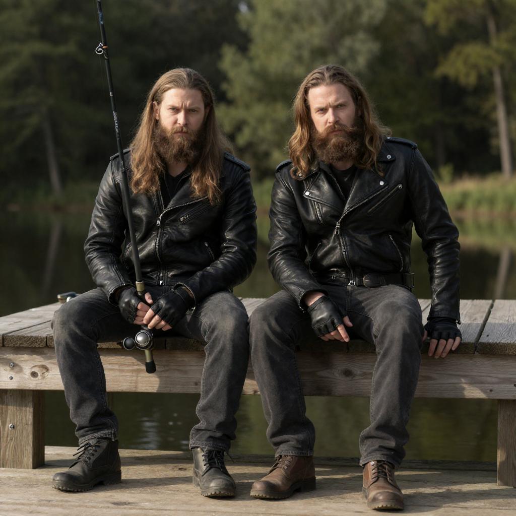Two men with long, blonde hair, wearing black leather jackets, dark shirts, and belts with bullet loops, walking through a green, leafy park. Both have beards and serious expressions. One holds a green cape over his shoulder. Background includes trees and greenery.