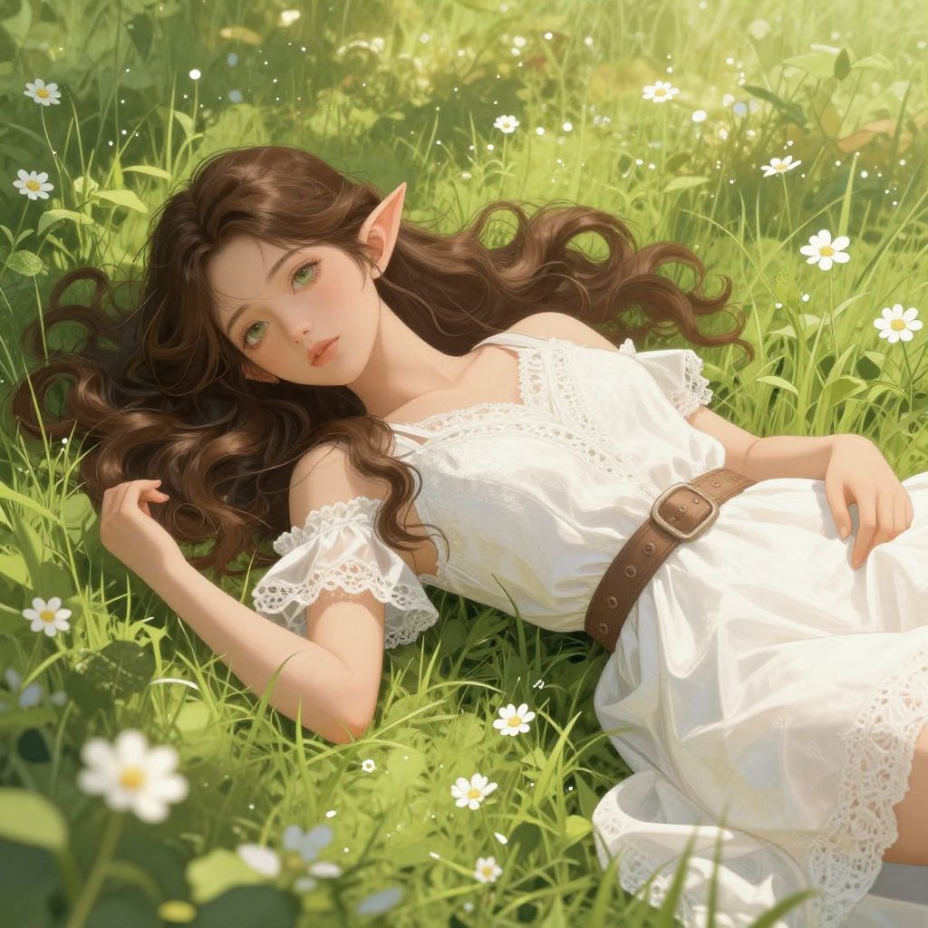 A digital illustration of a beautiful, young elven woman with long, wavy brown hair, lying in a sunlit meadow. She has pointed ears, fair skin, and green eyes, wearing a white, lacy dress with a brown belt. She's surrounded by white flowers and green grass, with sunlight filtering through the foliage, creating a magical, serene atmosphere.