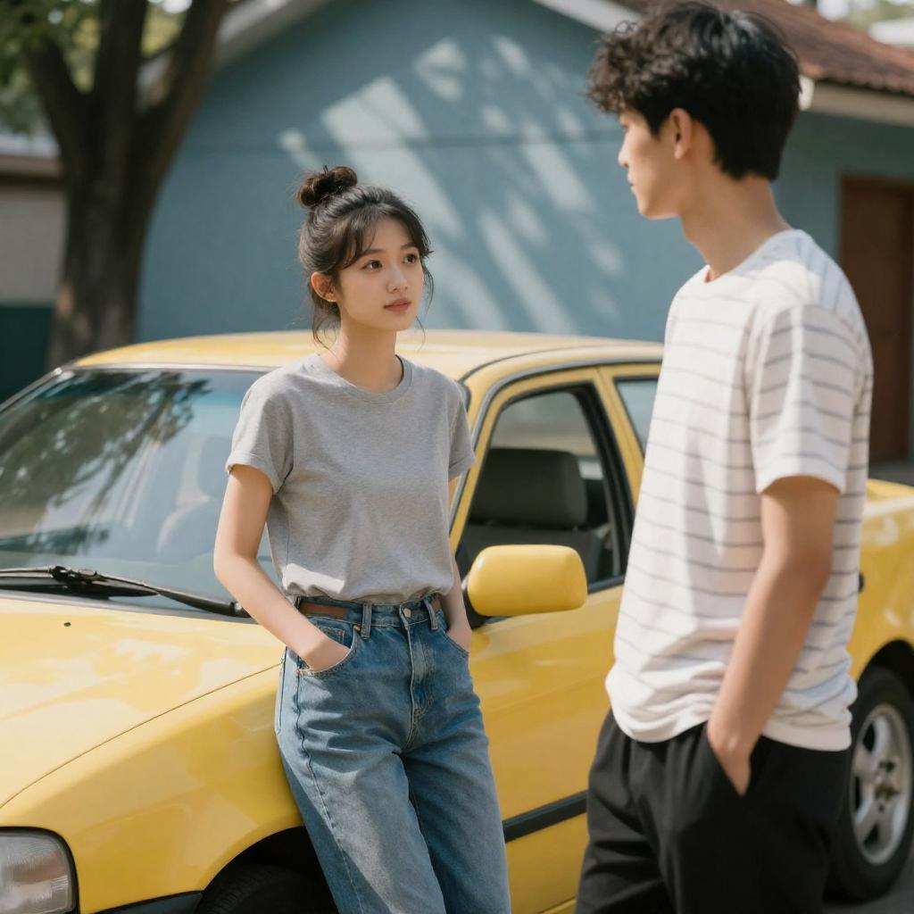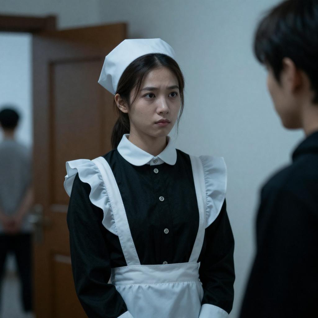 Photograph of a diner scene: a man in a dark suit sits at a counter, facing away, while a female server in a white and red uniform with a cap covers her mouth, standing to the right. The counter is cluttered with white paper cups and utensils. The background features black tiled walls and a brightly lit kitchen area.