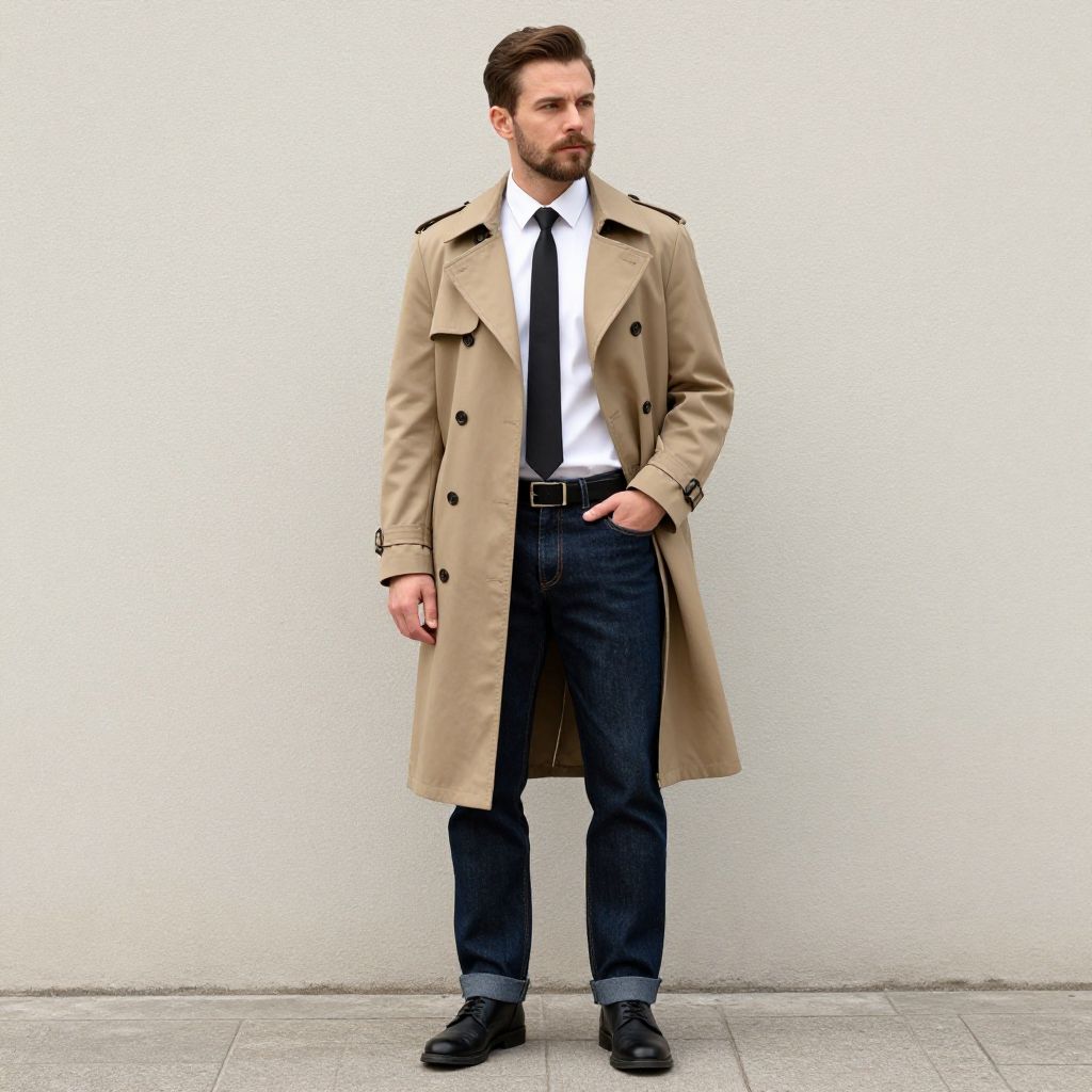 Photograph of a tall, handsome Caucasian man with a well-groomed beard and short brown hair, standing against a plain white wall. He wears a beige trench coat with black buttons over a white dress shirt and black tie, paired with dark blue jeans and black leather shoes. His right hand rests in his coat pocket, while his left arm hangs by his side. The ground is a light gray pavement. The man's expression is serious and confident, and the lighting is bright, highlighting the clean, minimalist style of the image.