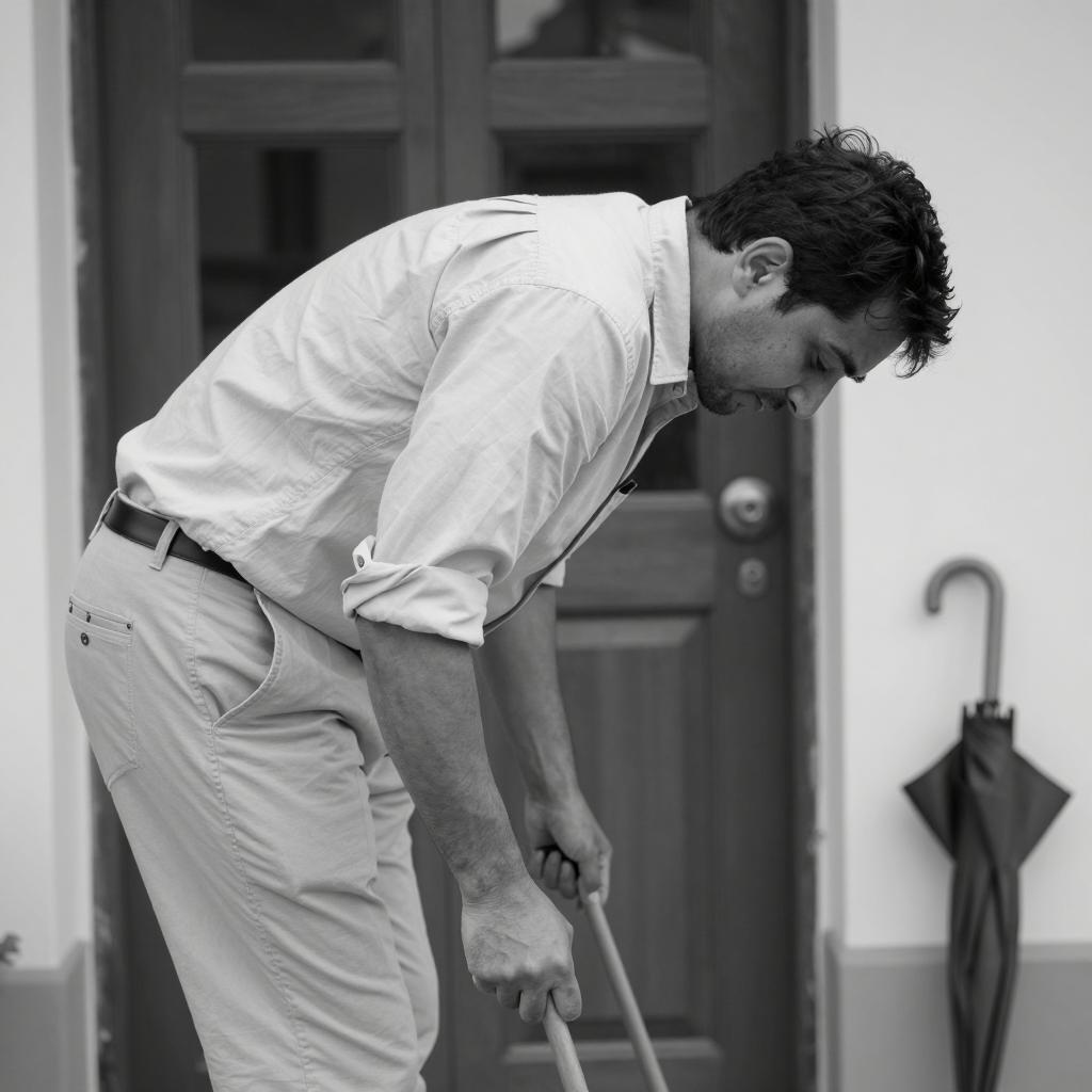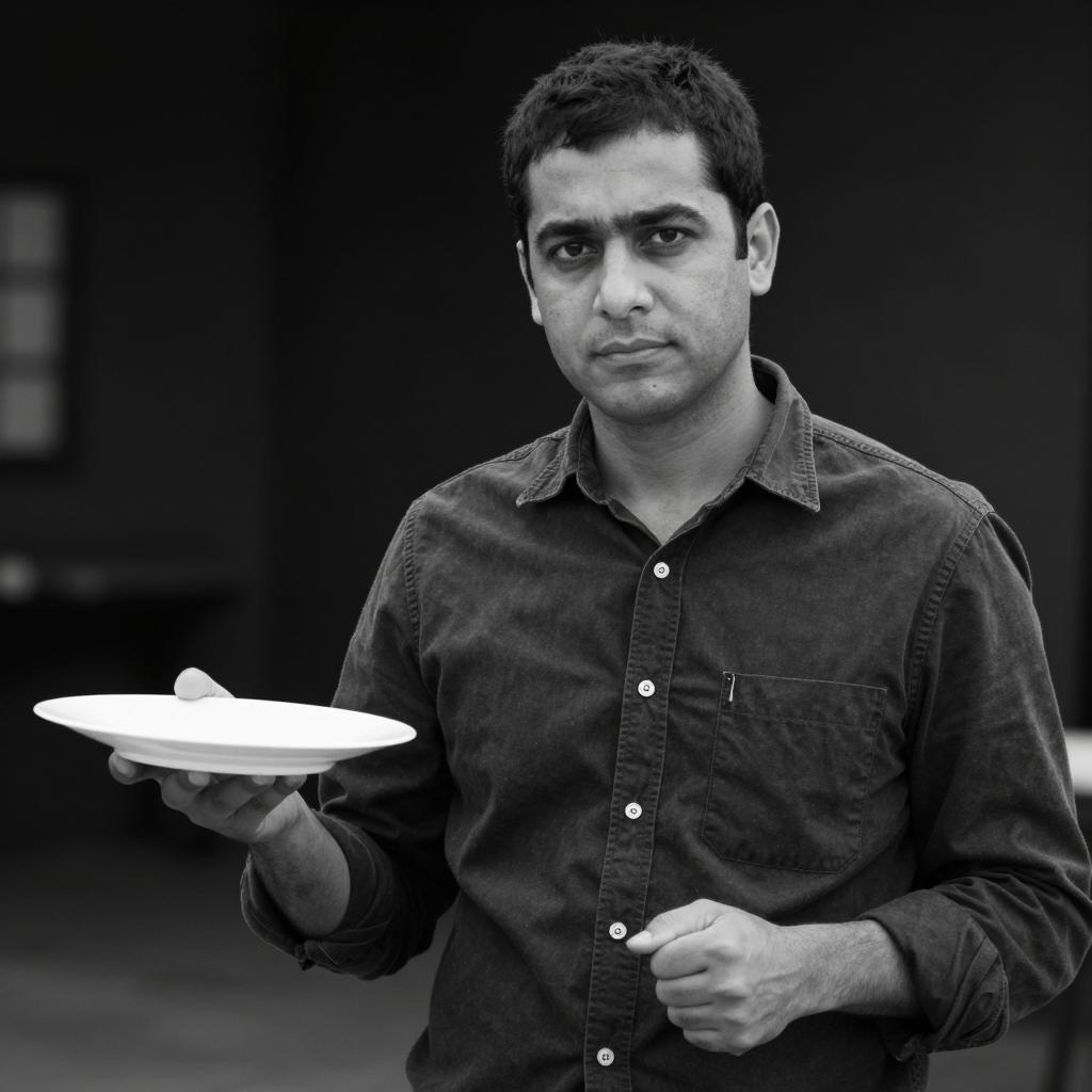 Black and white photograph of three men in a playground. Two men sit on a circular stone platform; one wears a striped jacket and looks down, the other in a patterned shirt looks at the man next to him. A third man crouches near a concrete slide, scratching his head. Background includes a fence and buildings.