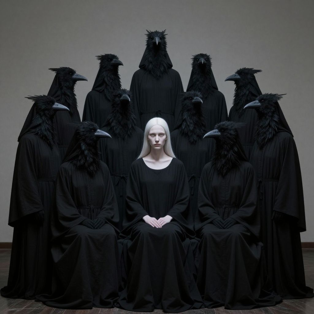 Photograph of a pale-skinned woman with long white hair, wearing a simple black dress, seated at the center. She has a calm, neutral expression. Surrounding her are eight tall, imposing figures dressed in black robes and bird masks, standing in a semi-circle. The background is a plain, gray wall, and the floor is dark wood. The overall composition is stark and eerie, with a high-contrast, minimalist style, emphasizing the central figure's vulnerability against the mysterious, masked figures. The lighting is cool, enhancing the somber, mysterious atmosphere.