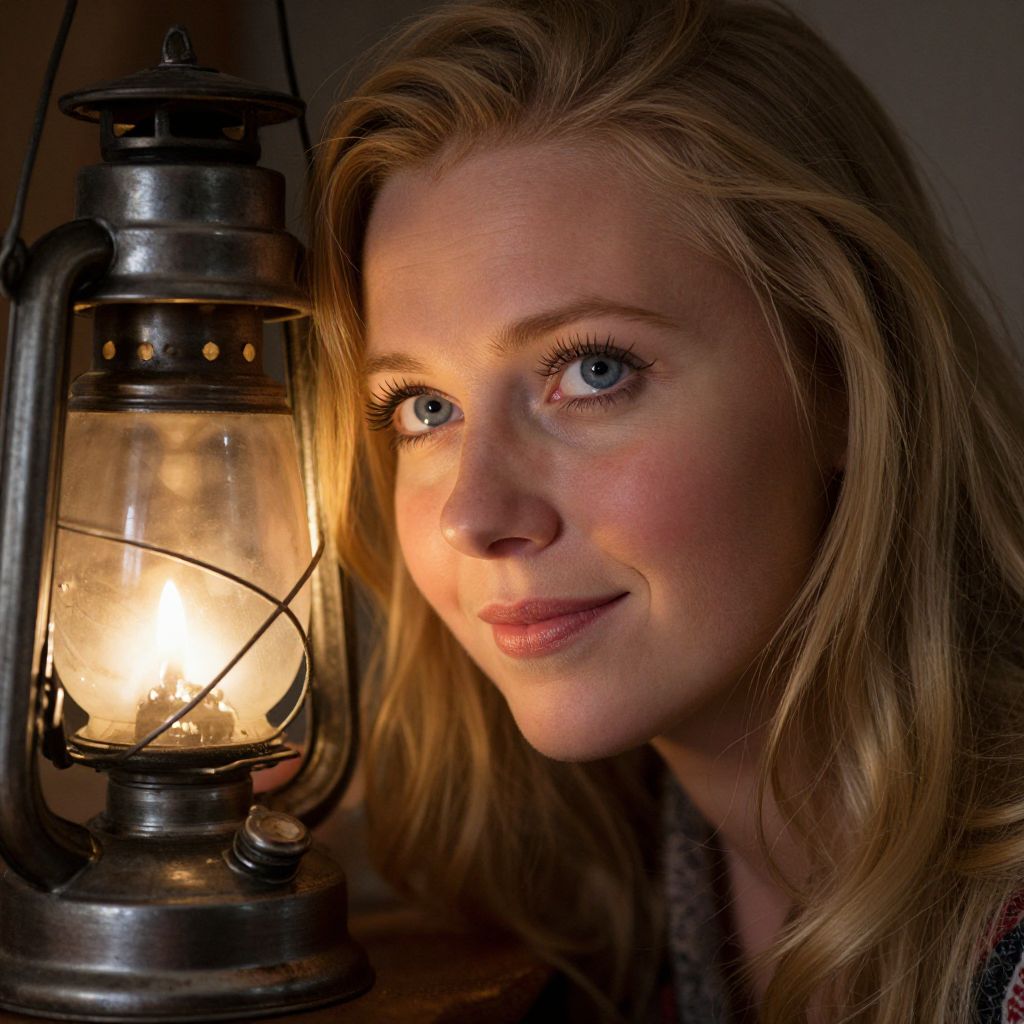Photograph of a blonde woman with blue eyes, soft smile, illuminated by a vintage lantern's warm light, against a dark background.