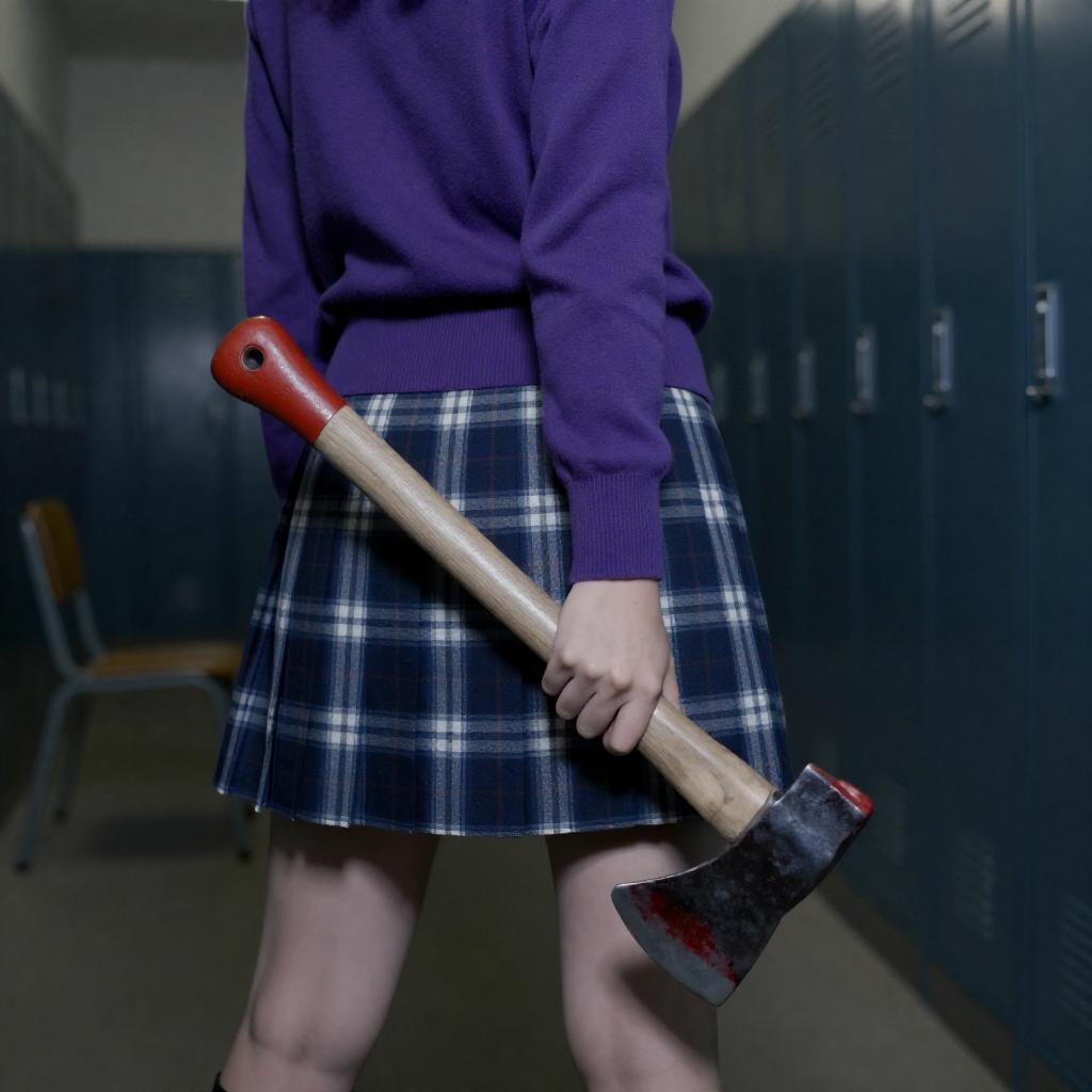 Photograph of a person from behind, wearing a purple sweater and blue plaid skirt, holding a bloody axe in their right hand. Corridor with lockers and a chair in the background. Person's legs are visible. Dark, eerie lighting.