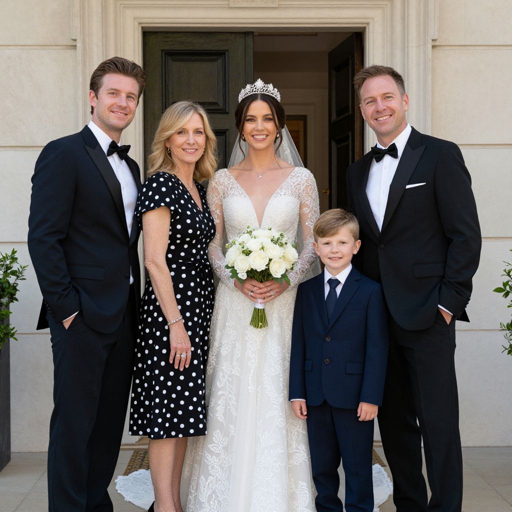 Photograph of a smiling bride in a white lace gown, holding a bouquet, flanked by groom, mother in polka-dot dress, and son