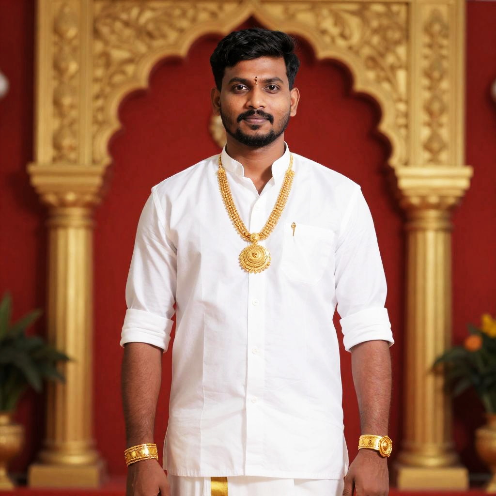 Tamil Wedding Dress Man, a man in a white shirt and gold necklace standing in front of a red and gold archway
