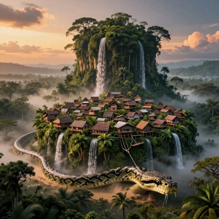 Hyper-realistic scene of a giant ancient amazona python with a village built on its back, The python's back is covered in thick forest, dense Amazone with towering trees, water cascading down its sides, and a hidden, dusty and misty village nestled in the foliage, The amazona village consists of intricately designed village houses that blend seamlessly with the natural environment, featuring rope bridges connecting different sections of the village, The python moves slowly through an endless amazona forest, with sand gently crashing against its sides, Above, the sky is a mix of warm sunset hues and stars beginning to peek through the twilight, The atmosphere is magical and serene, evoking a sense of wonder and timelessness, The image captures the harmony between nature and civilization, with soft, ambient lighting enhancing the mystical ambiance, The perspective is wide, emphasizing the grandeur of the python and the tiny yet intricate details of the village