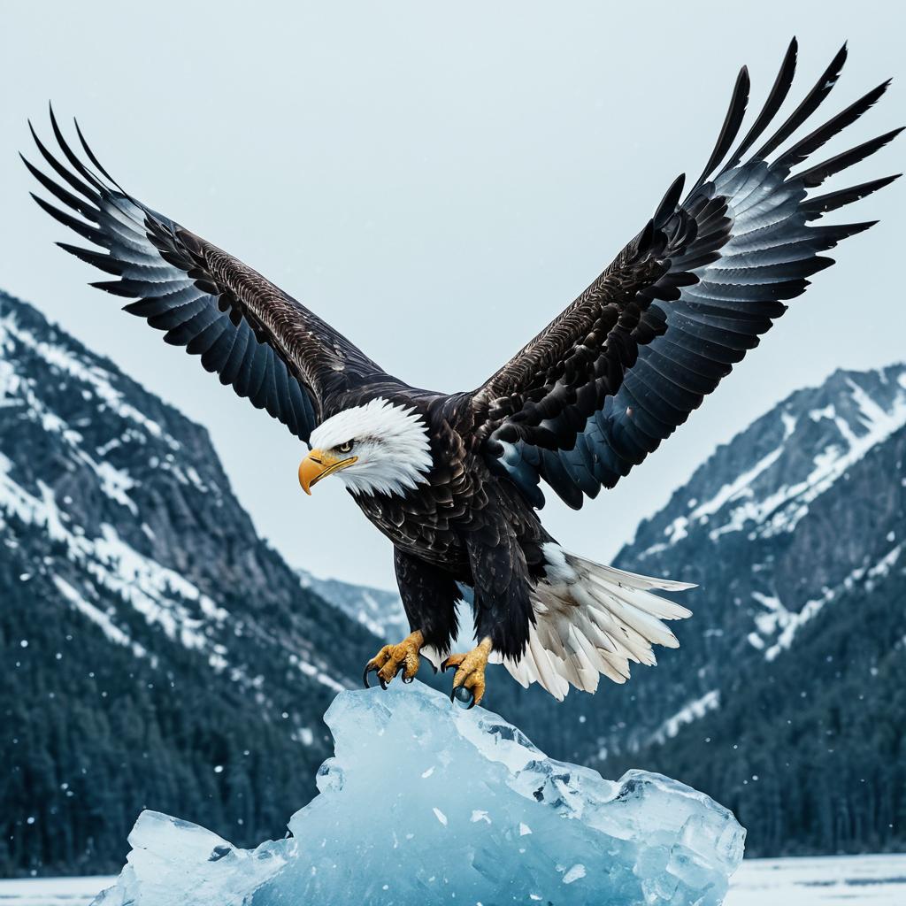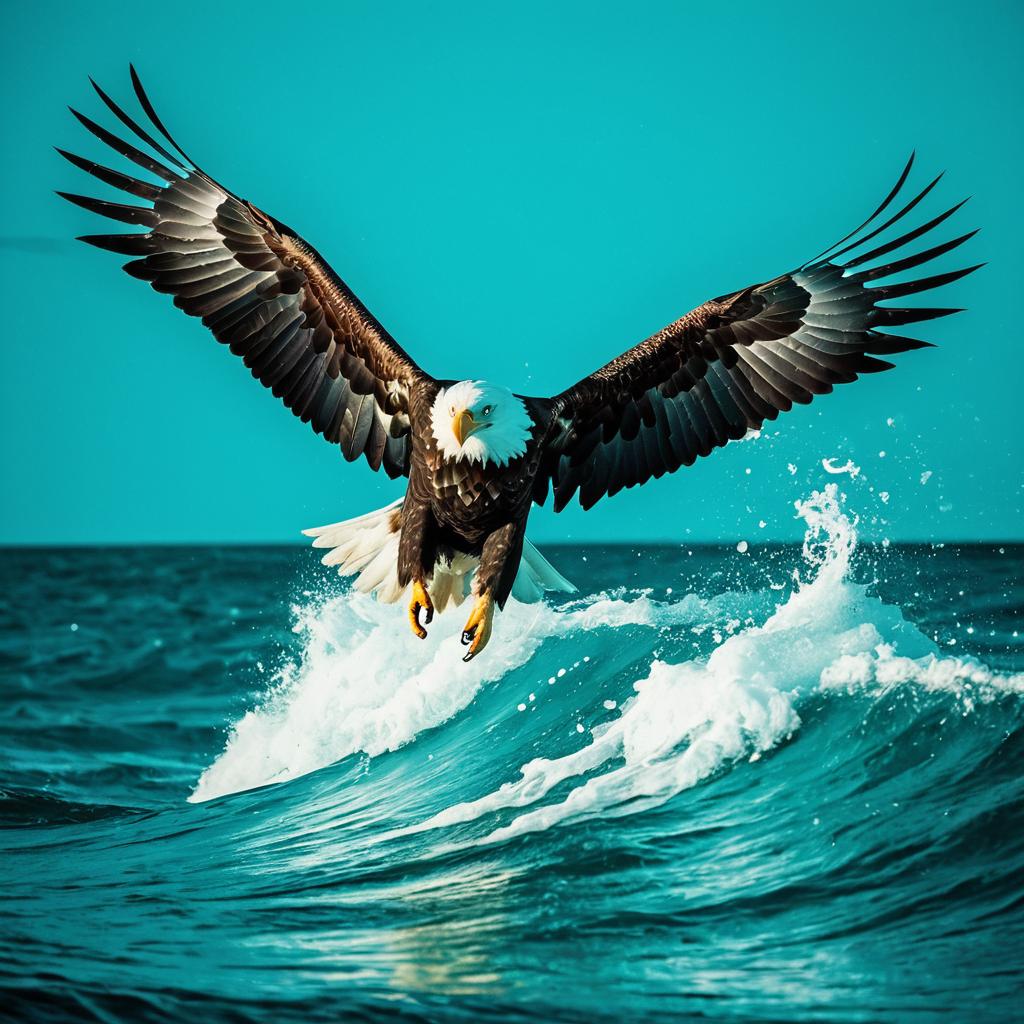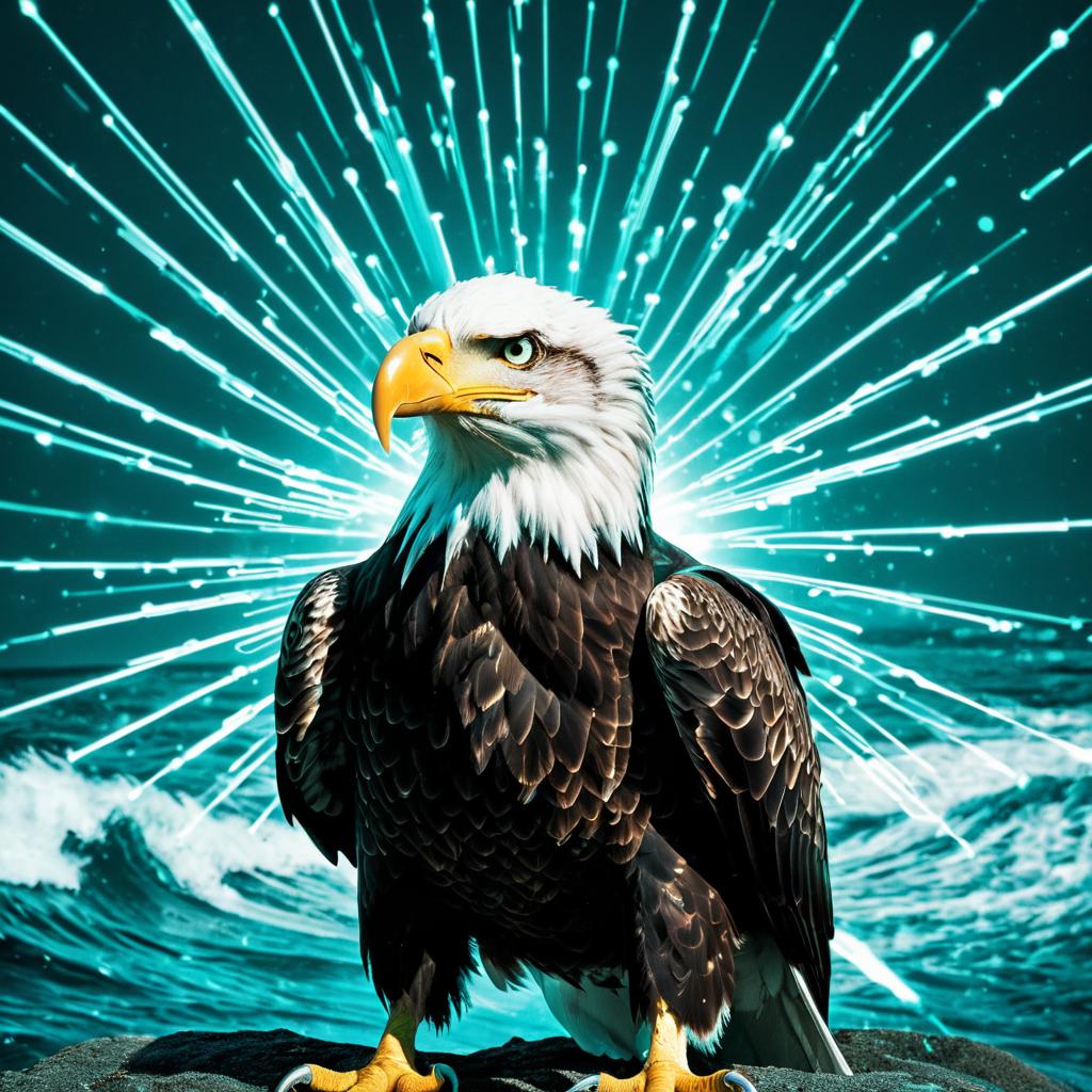 Radiant isotope, a bald eagle's essence distilled into its purest radioactive form, its glowing body a study in the beauty of atomic particles, pulsating turquoise waves, precise electron trajectories