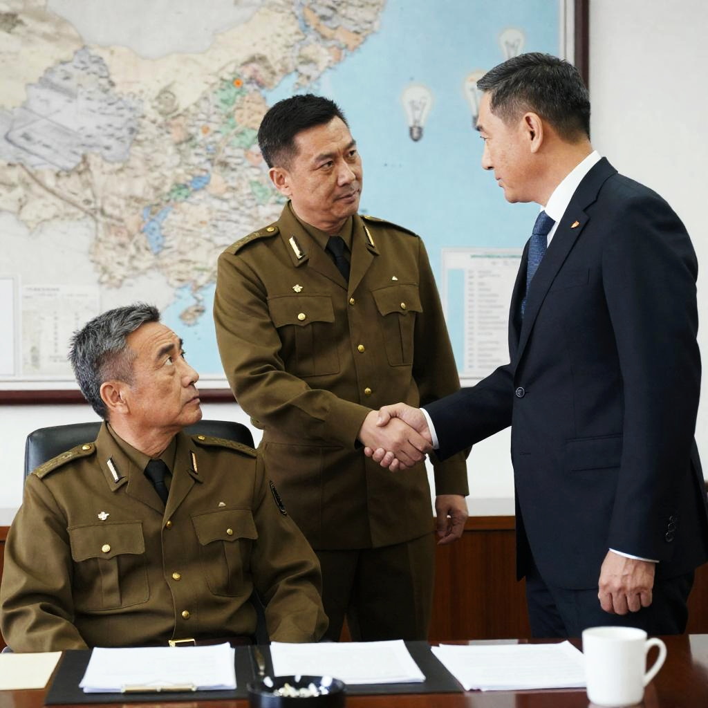 Photograph of three men in a military office. Two men in military uniforms, one standing, one sitting, both with light brown jackets and dark ties. One man in dark suit stands, shaking hands with the standing officer. Map with lightbulbs on wall in background. Seated officer with gray hair, looking at standing officer. Desk with papers, ashtray, and cup. Intense expressions on standing officers' faces.
