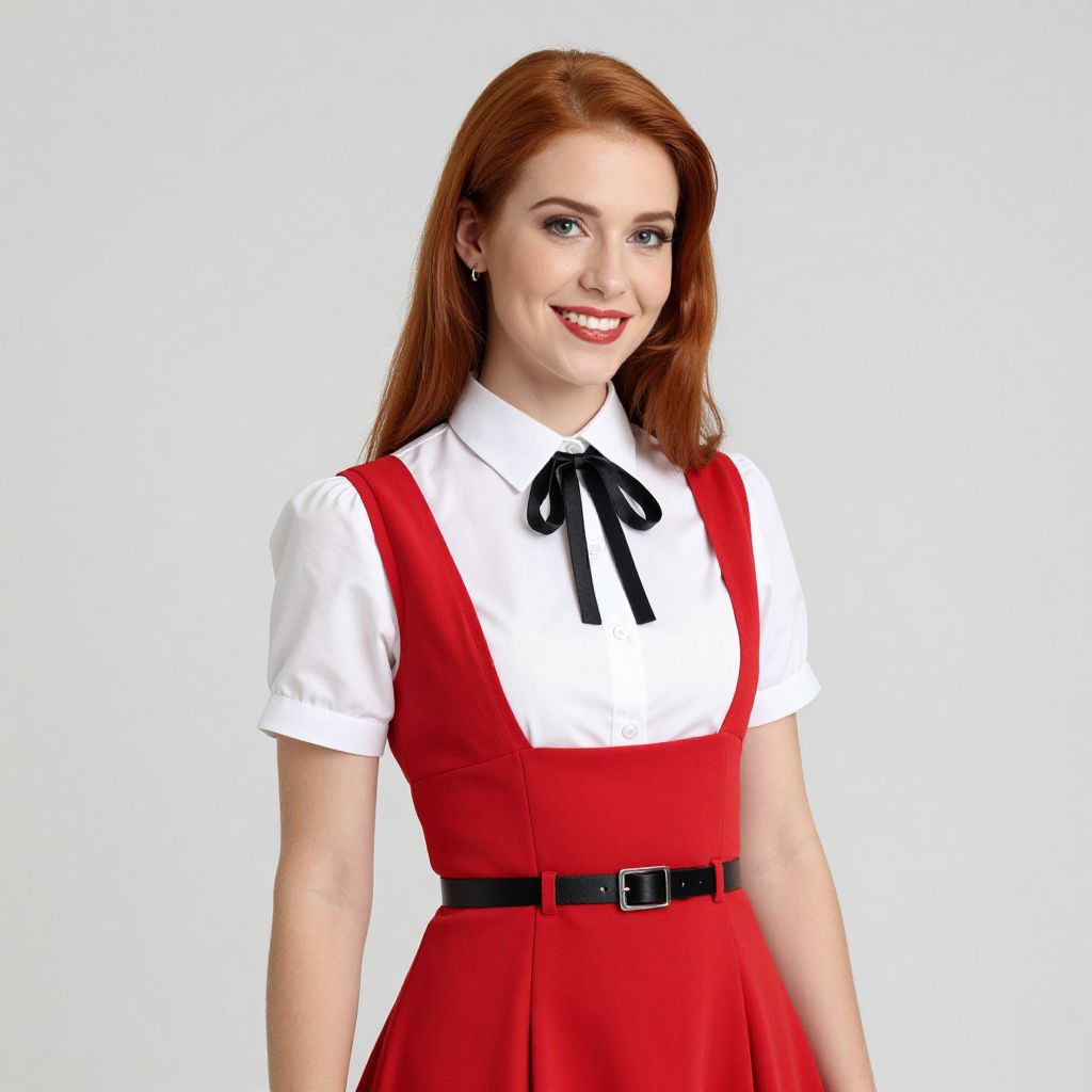 Ruby Rhod Costume, woman with red hair and a white shirt and red dress