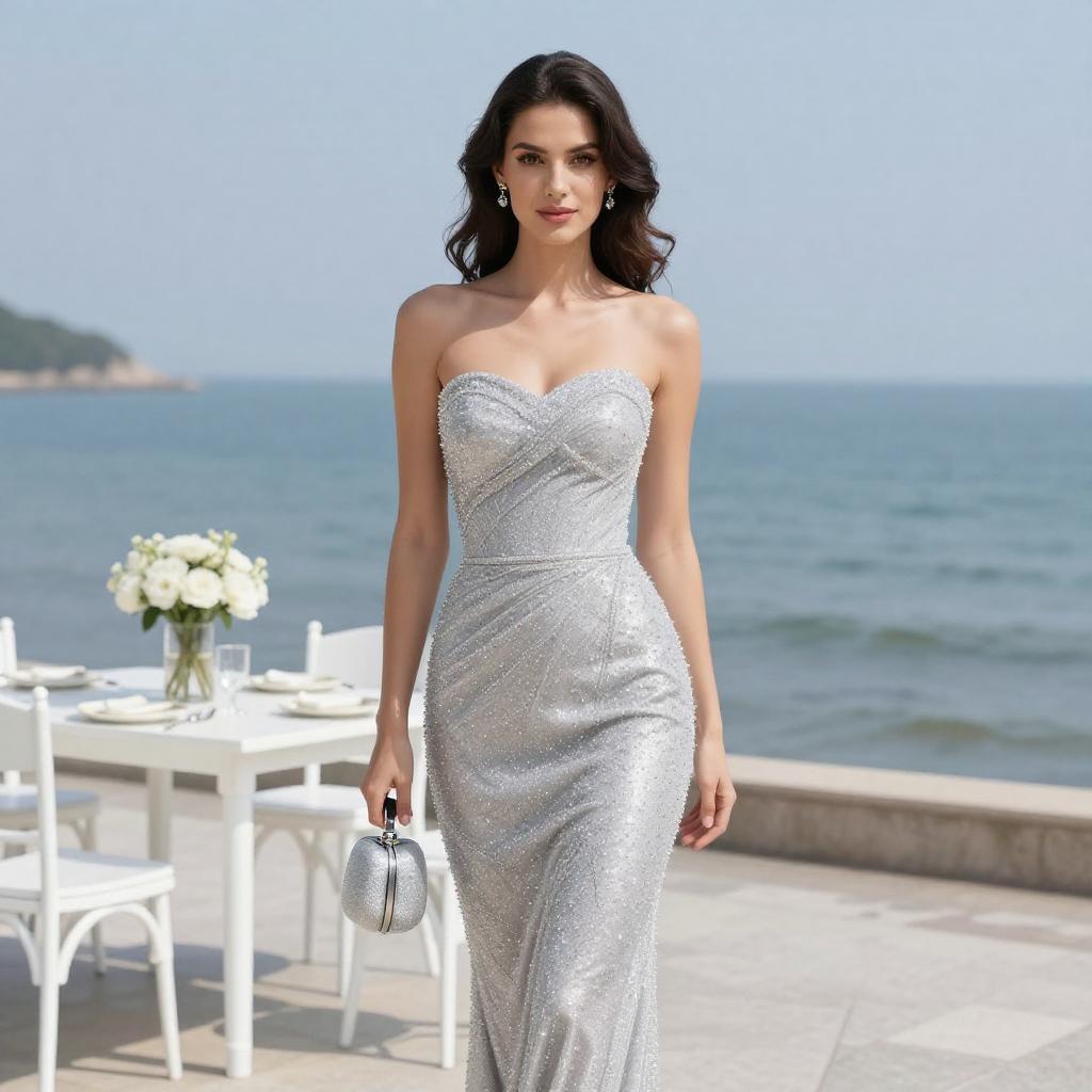 Photograph of a beautiful woman with dark, wavy hair in an elegant updo, standing outdoors by the ocean. She's wearing a strapless, silver, sparkling gown that hugs her slender figure, and holds a small silver clutch in her right hand. In the background, there's a white table with chairs, a vase of white flowers, and a clear blue sea under a bright sky.