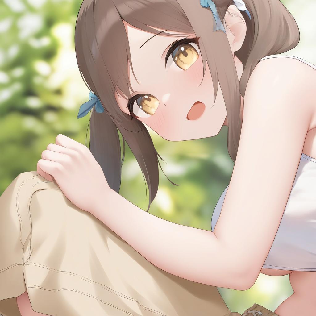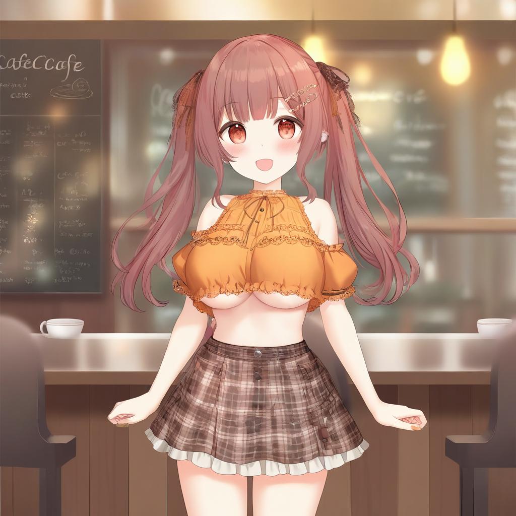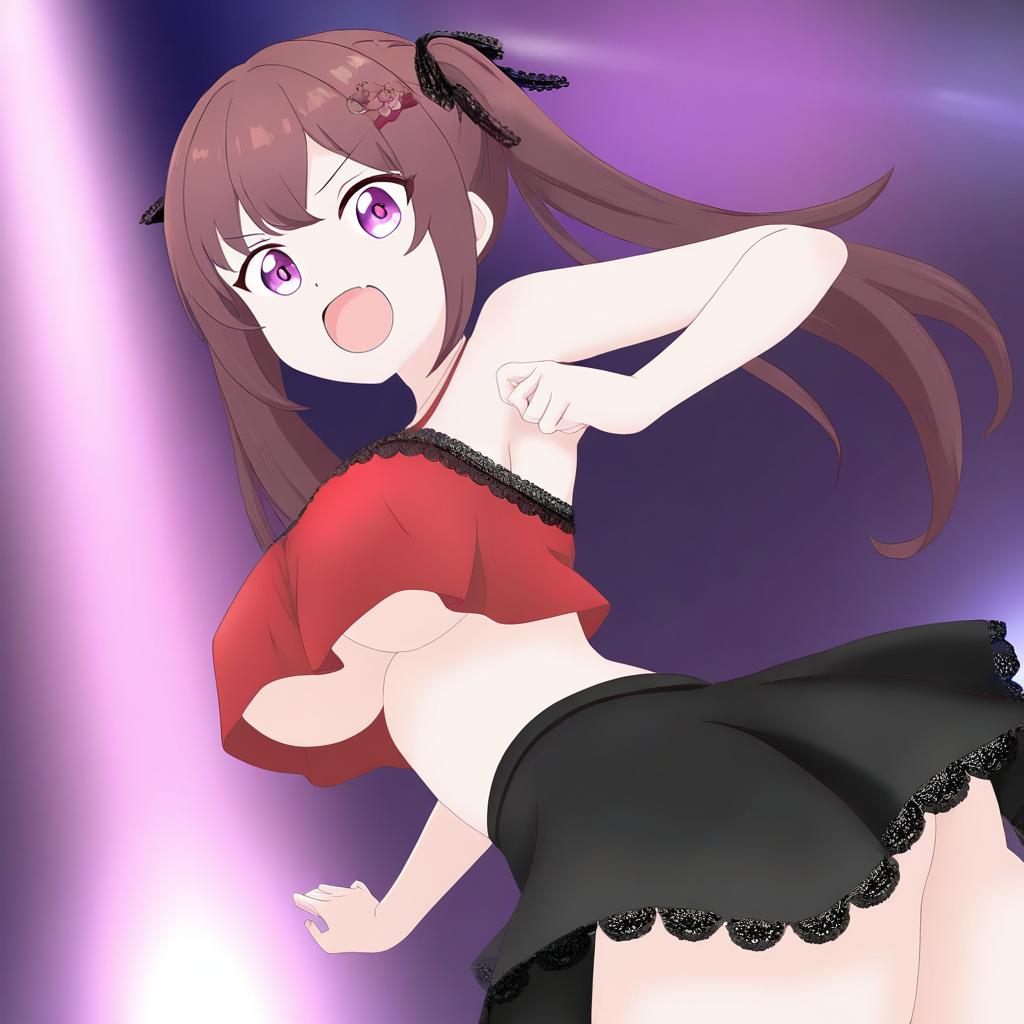 1girl, solo, looking at viewer, long hair, twintails, brown hair, hair ornament, hair ribbon, open mouth, expression detail, large breasts, underboob, anatomical detail, bare shoulders, sleeveless, crimson camisole, lace edges, black skirt, concert, dynamic pose