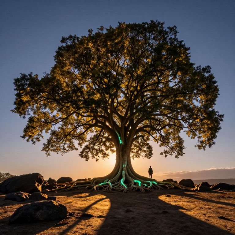 Majestic tree bathed in radiant golden light stands tall against a twilight sky, its sprawling roots illuminated by bioluminescence as a solitary figure walks beneath its vast canopy, casting long shadows on the rocky ground.