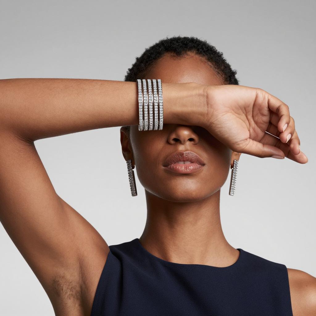 Portrait of a woman with short black hair and dark skin wearing a dark blue sleeveless top. She has full lips and her right arm raised to cover her eyes, displaying a thick silver diamond-encrusted bracelet. She also wears matching dangling diamond earrings. The background is a smooth gradient from light gray to white.