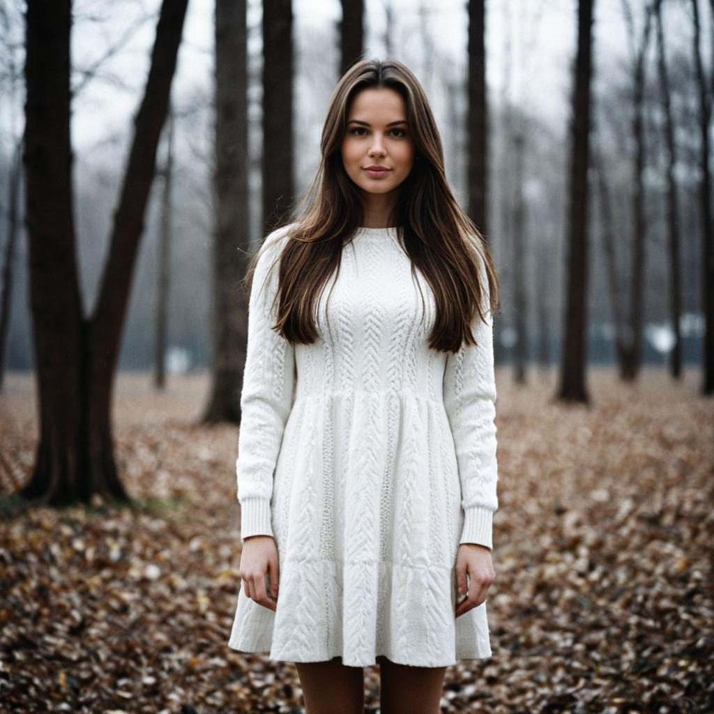 A young woman with long brown hair standing outdoors in a forest during winter. She is wearing a white long-sleeve knitted dress with a textured pattern. The background consists of bare trees and fallen leaves, creating a blurred, wintry atmosphere. The woman is looking directly at the camera with a neutral expression, her arms resting at her sides.
