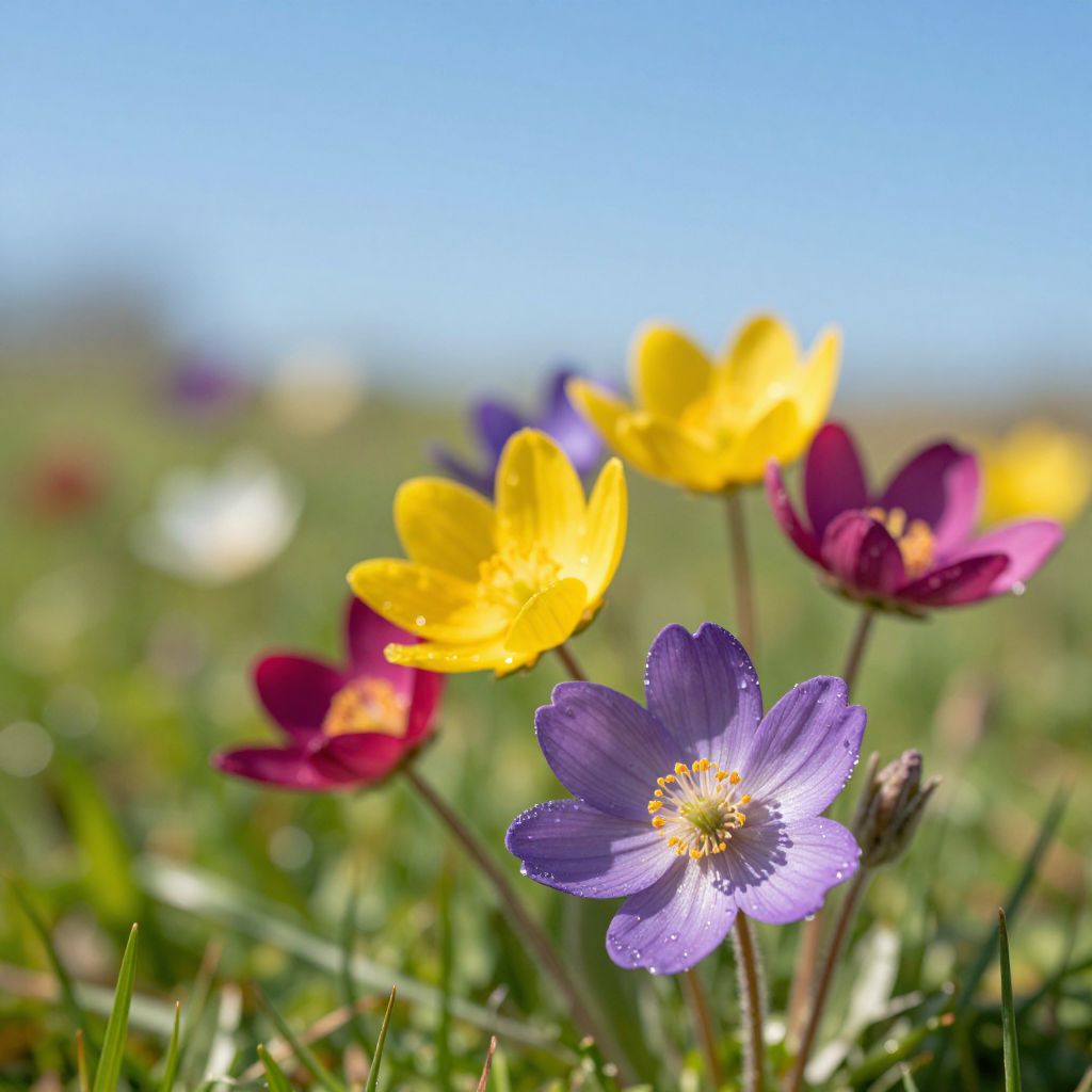 Close-up of vibrant purple, yellow, and magenta wildflowers blooming in a sunlit meadow during spring. The flowers have detailed petals with visible dewdrops and are set against a softly focused green meadow and clear blue sky. Natural lighting enhances the fresh and lively atmosphere.