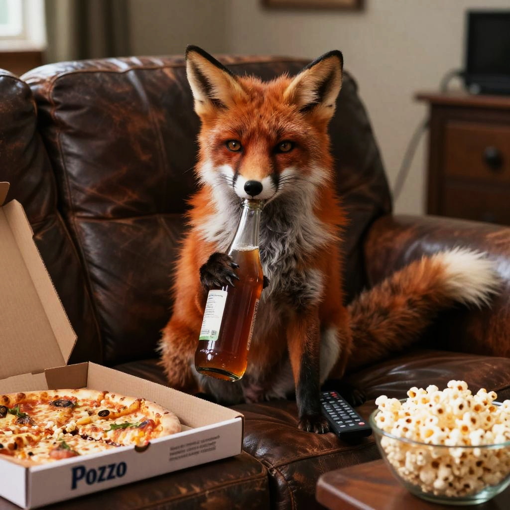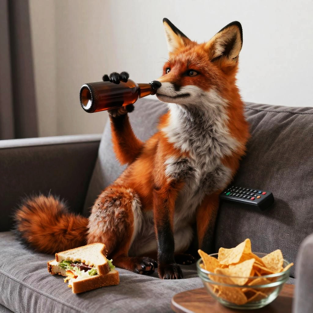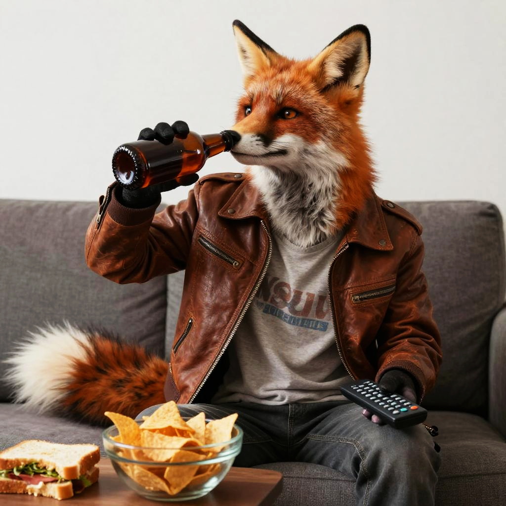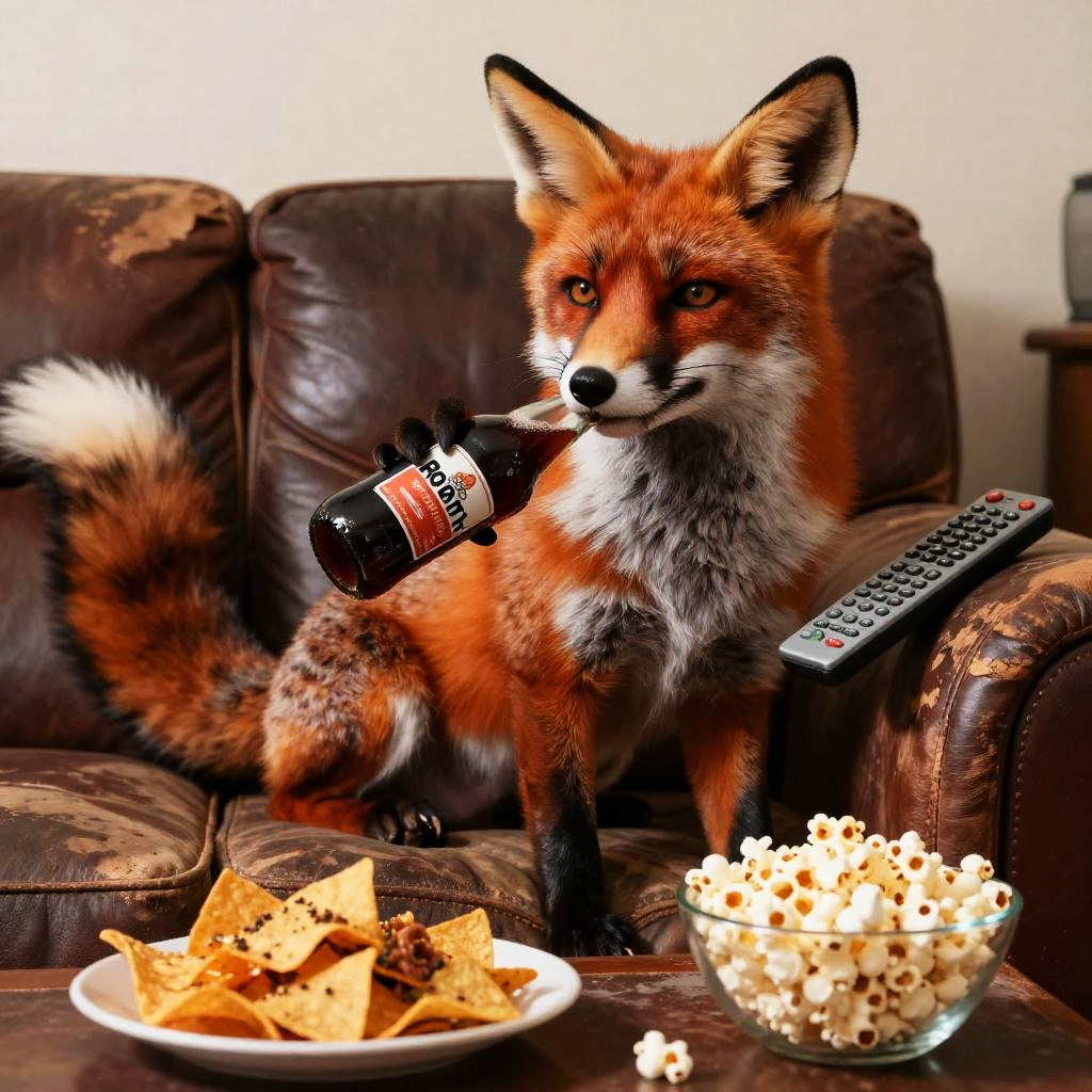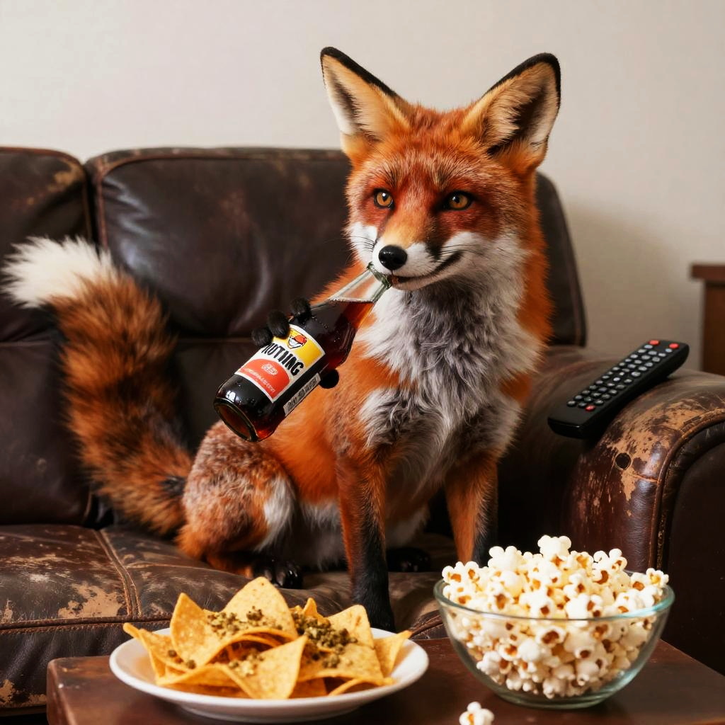 Anthropomorphic red fox with auburn-red fur and white chest, large bushy tail with white tip sitting on a worn leather couch, holding glass bottle of root beer and a TV remote control, drinking a sip from the bottle, looking at the viewer with a sly, friendly smile, plate of loaded nachos and a bowl of popcorn on a side table