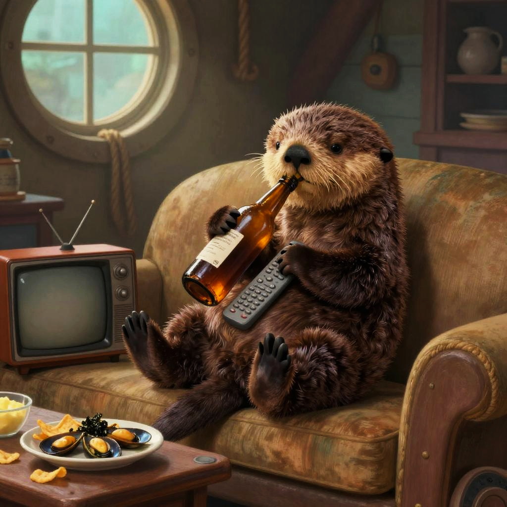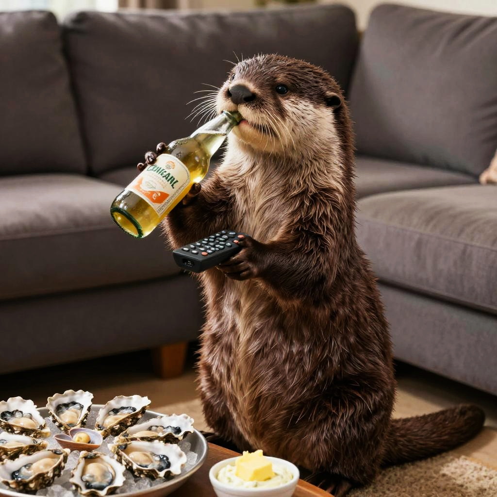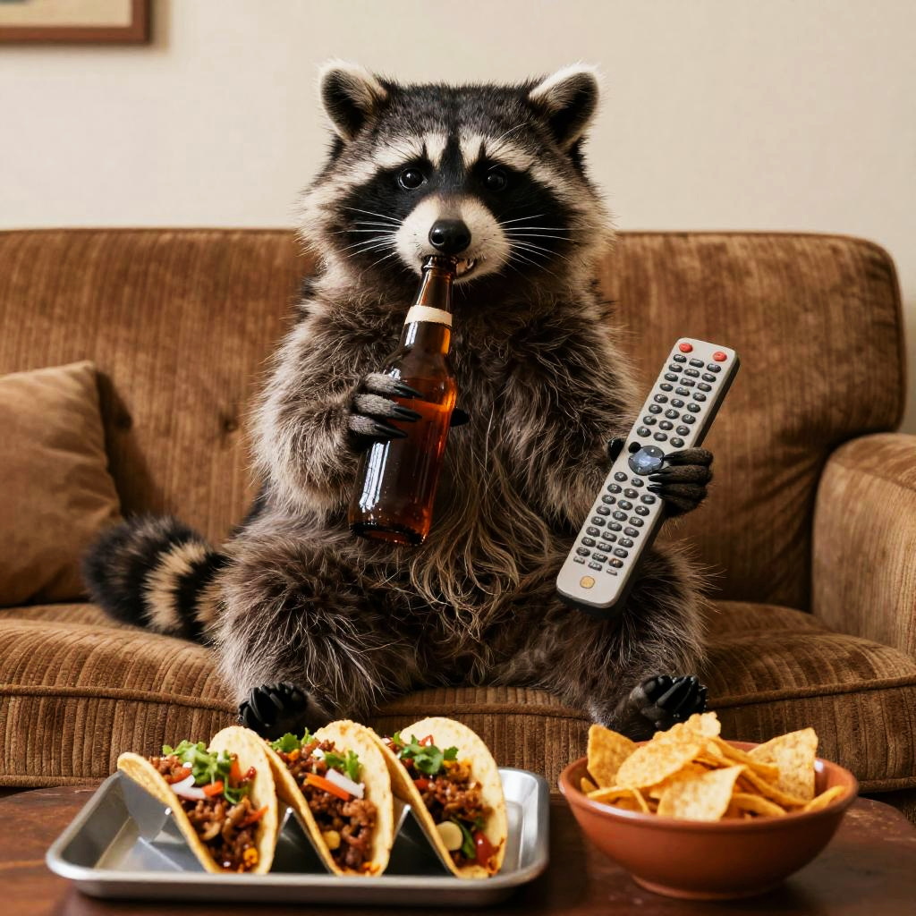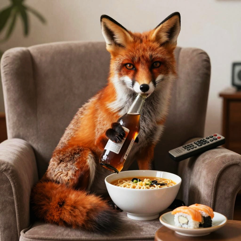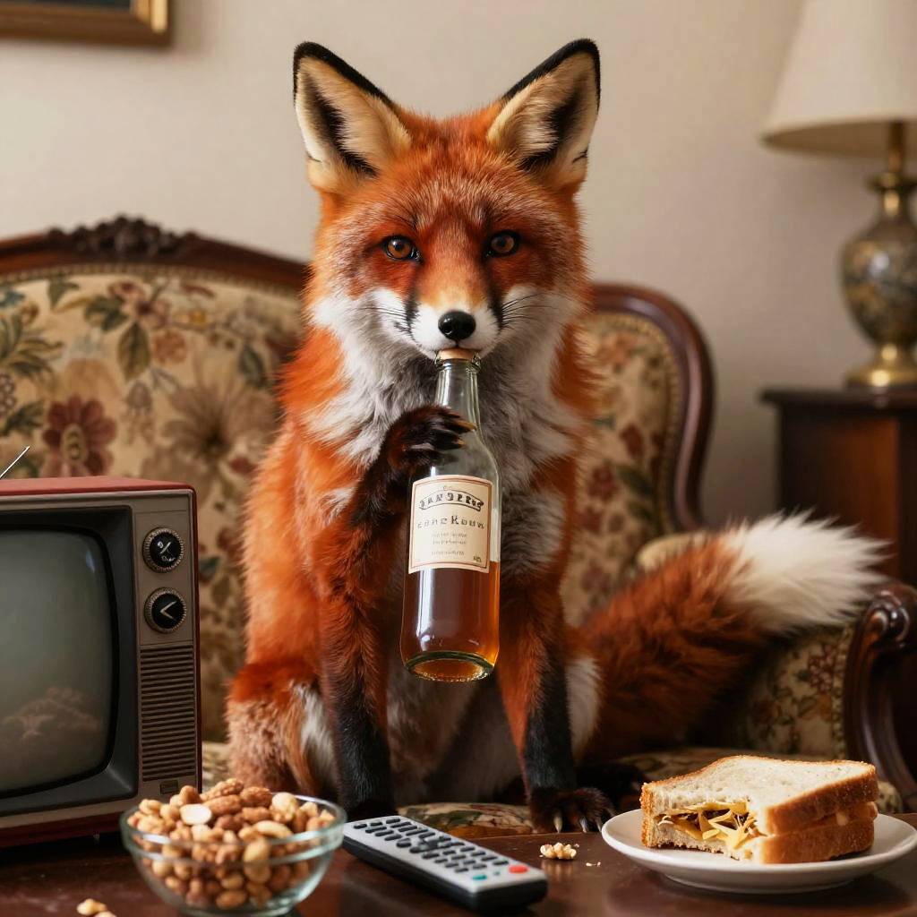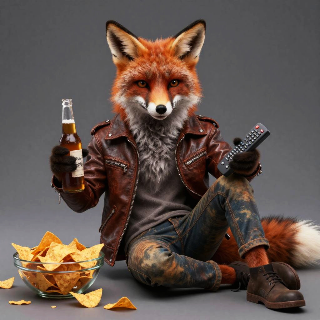 Anthropomorphic red fox with auburn-red fur and white chest, large bushy tail with white tip sitting on a worn leather couch, holding glass bottle of root beer and a TV remote control, drinking a sip from the bottle, looking at the viewer with a sly, friendly smile, plate of loaded nachos and a bowl of popcorn on a side table