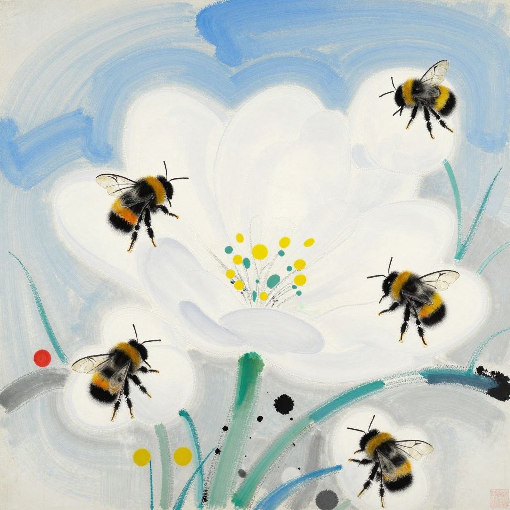 Watercolor painting of five bumblebees hovering around a white, blooming flower with yellow and green dots, set against a blue and white sky