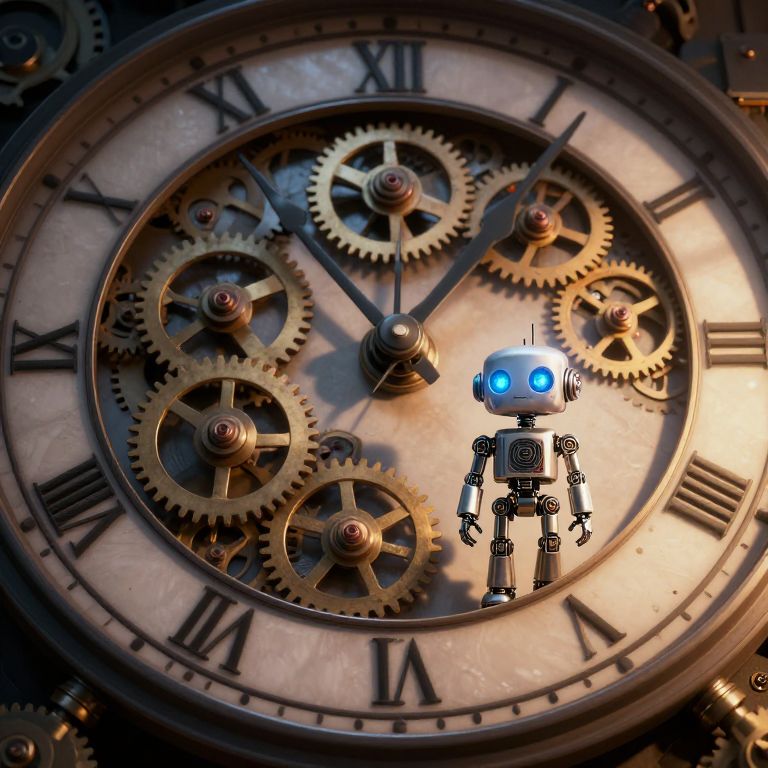 Envision an enthralling digital artwork where a diminutive robotic figure stands amidst the gears and cogs of a colossal, intricately crafted clock face. This tiny metallic explorer, adorned with intricate mechanisms, is dwarfed by the towering hands that cast dramatic shadows across its surface. As the clock's heartbeat echoes through the air, the robot's luminous eyes reflect the magic of exploration as it navigates the ticking parts, invoking a blend of awe and trepidation. The scene masterfully captures the juxtaposition of intricate engineering and whimsical adventure, stirring a spectrum of emotions from wonder to curiosity.