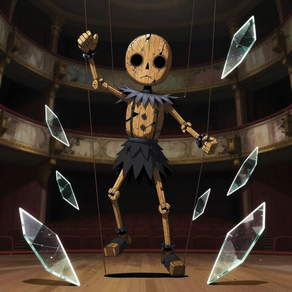 A cursed marionette, with cracked wooden face with hollow eyes, holding twisted puppet strings, surrounded by floating shards of broken glass, in an abandoned theatre stage, illustrated in the dramatic and gothic anime style of Kouta Hirano.