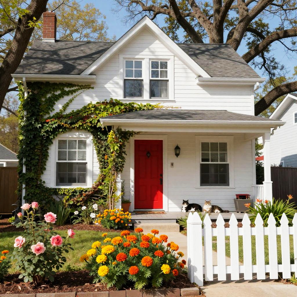 Cute suburban house with vibrant red door and ivy climbing the walls, front yard boasting colorful marigolds and roses, a small white picket fence, two cats lounging in the porch, soft shadows from tall oak trees under a bright, clear spring day.