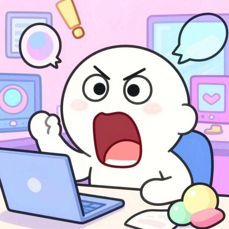 A digital cartoon drawing of a round, white, faceless character with large, angry eyes and an open mouth, shouting in surprise. The character is seated at a desk with a blue laptop. Behind them are three colorful computer monitors showing circular and heart shapes. A speech bubble with a blue background is to the character's right, and a yellow exclamation mark is above their head. The character has a multicolored, spherical object on their lap. The background is a pastel pink and blue gradient. The style is colorful, exaggerated, and comic-like.