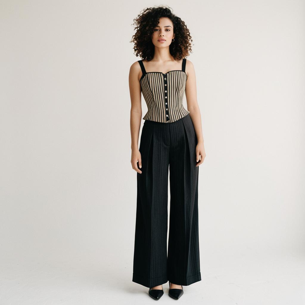 Woman, modern casual, black corset-style top with structured bodice, high-waisted, wide-leg pleated trousers in a beige vertical stripe, flat black shoes, no visible jewelry, minimal makeup, natural curly hair, white studio background.