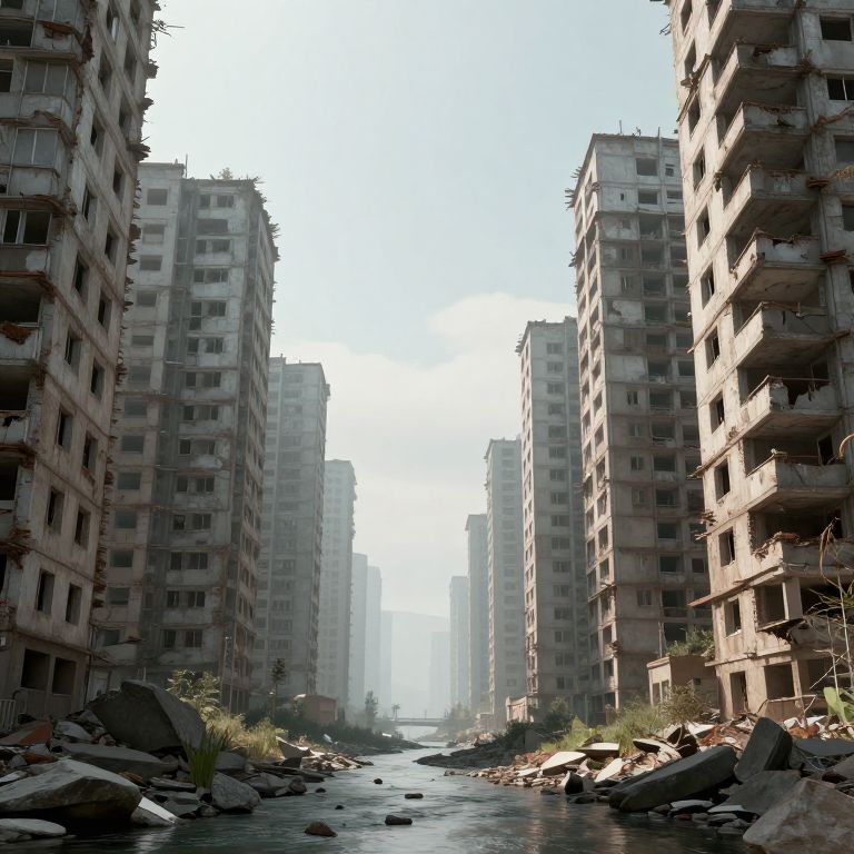 An atmospheric 3D-rendered scene depicts a surreal urban landscape where abandoned, deconstructed apartment buildings stand in reverse order, creating a hauntingly symmetrical corridor flanked by rocky riverbeds under soft, ethereal lighting.