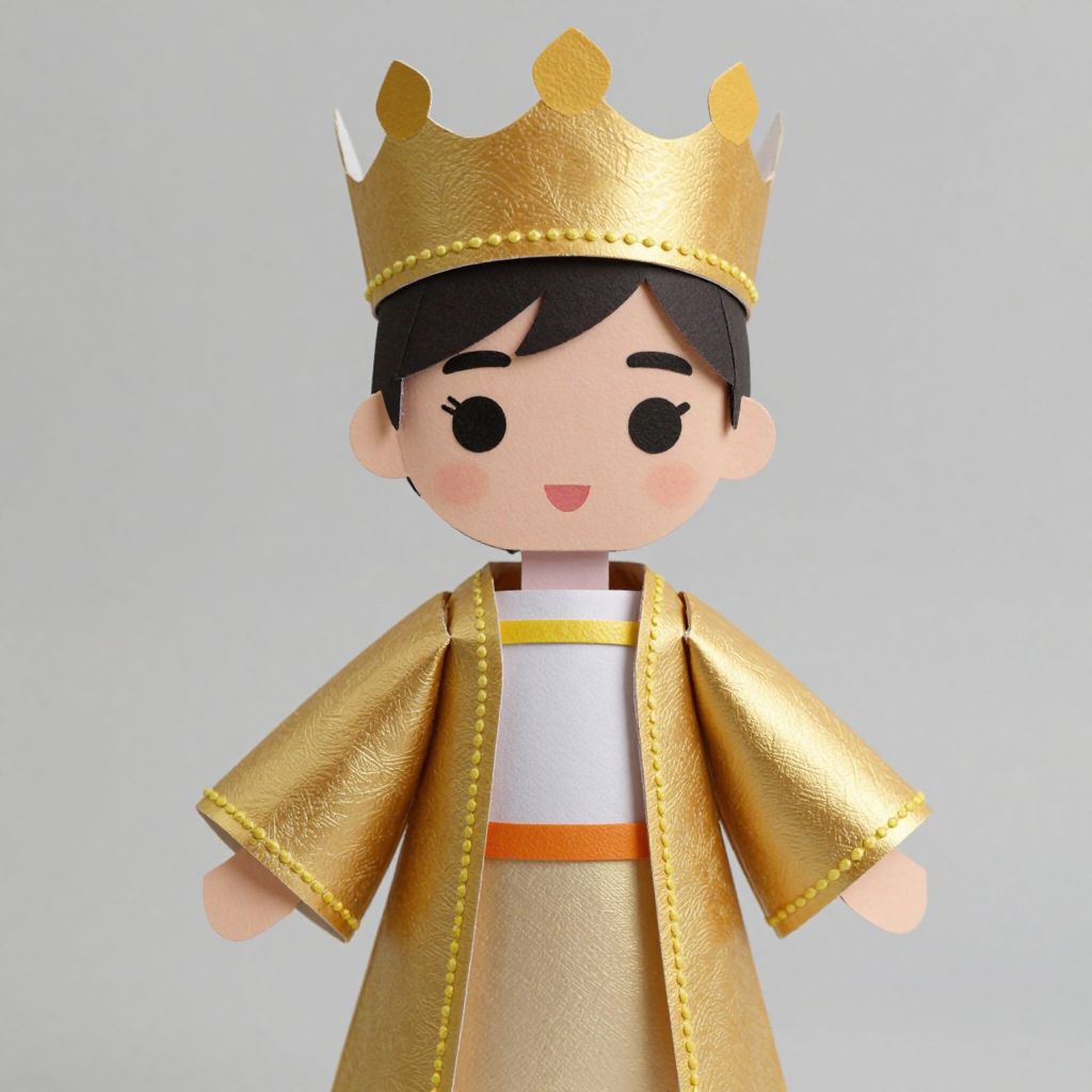 Photograph of a 3D cartoon-style figurine of a child with fair skin, black hair, and large black eyes. The child wears a golden crown with three small points and a matching golden robe with a textured surface. The robe has a white and orange-striped tunic underneath. The figurine has a simple, cheerful expression with a small, open mouth. The background is plain white, highlighting the golden colors of the crown and robe. The overall style is playful and whimsical, with a focus on bright, shiny gold elements.