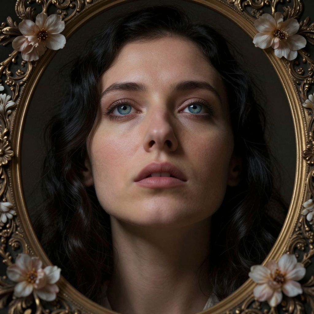 Photograph of a young woman with fair skin, blue eyes, and wavy dark brown hair. Her expression is neutral, with slightly parted lips. She is centered in an ornate, gold-framed oval mirror adorned with white and pink flowers. The lighting is soft, highlighting her clear complexion and subtle facial features. The background is dark, making her face the focal point. The mirror's intricate design contrasts with her natural beauty, creating a timeless, classic aesthetic. The image is highly detailed, capturing textures in both her skin and the mirror's frame.