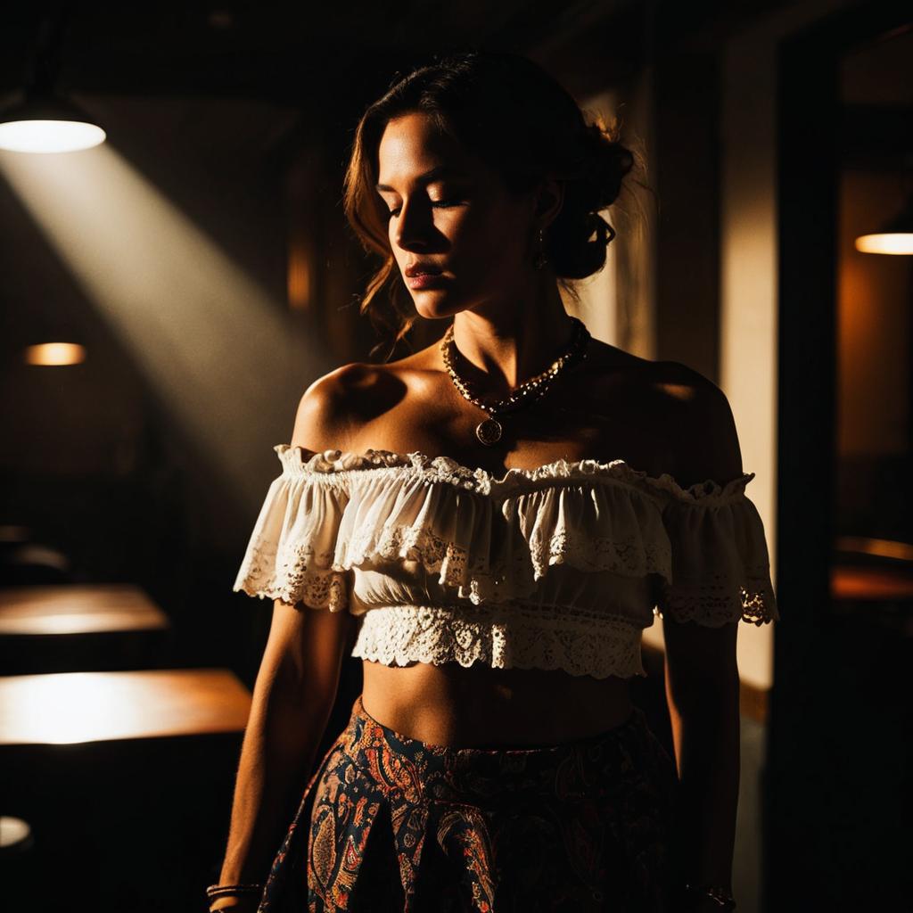 Portrait of a young woman wearing an ivory off-shoulder cropped lace top with delicate ruffle detailing and a long fitted paisley patterned skirt. She accessorizes with layered gold necklaces and thin bangle bracelets. The photo features soft cinematic lighting with a warm, moody atmosphere and shallow depth of field, highlighting the woman's facial features and outfit.