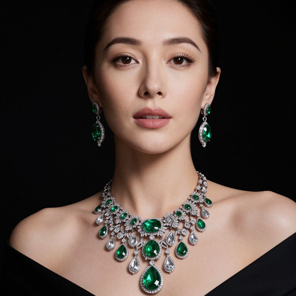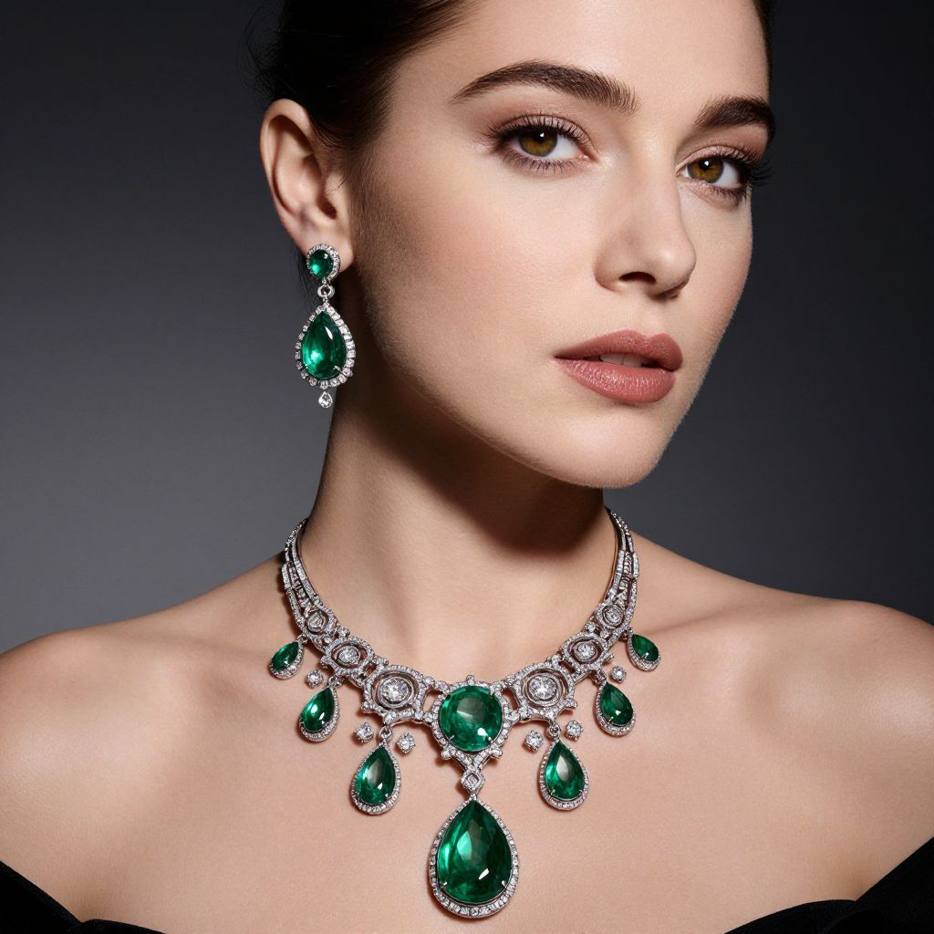 A glamorous portrait featuring a woman adorned in exquisite diamond and emerald jewelry, showcasing a high-definition, elegant aesthetic reminiscent of classic luxury brands like Fabergé, with dramatic lighting accentuating the intricate details of her necklace and earrings.