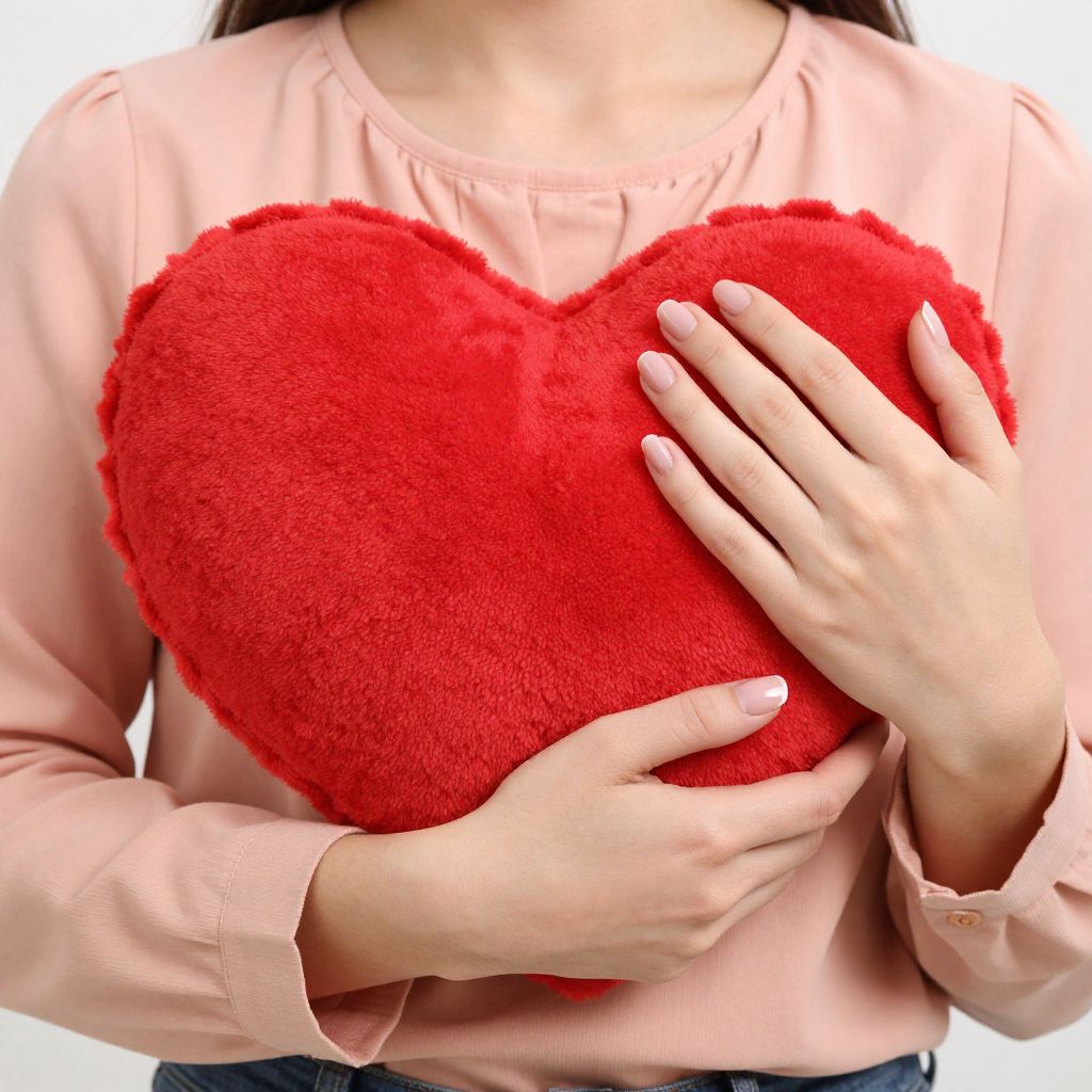 Woman tenderly cradling a vibrant red plush heart-shaped cushion against her chest, showcasing manicured nails and a soft blush-toned blouse.