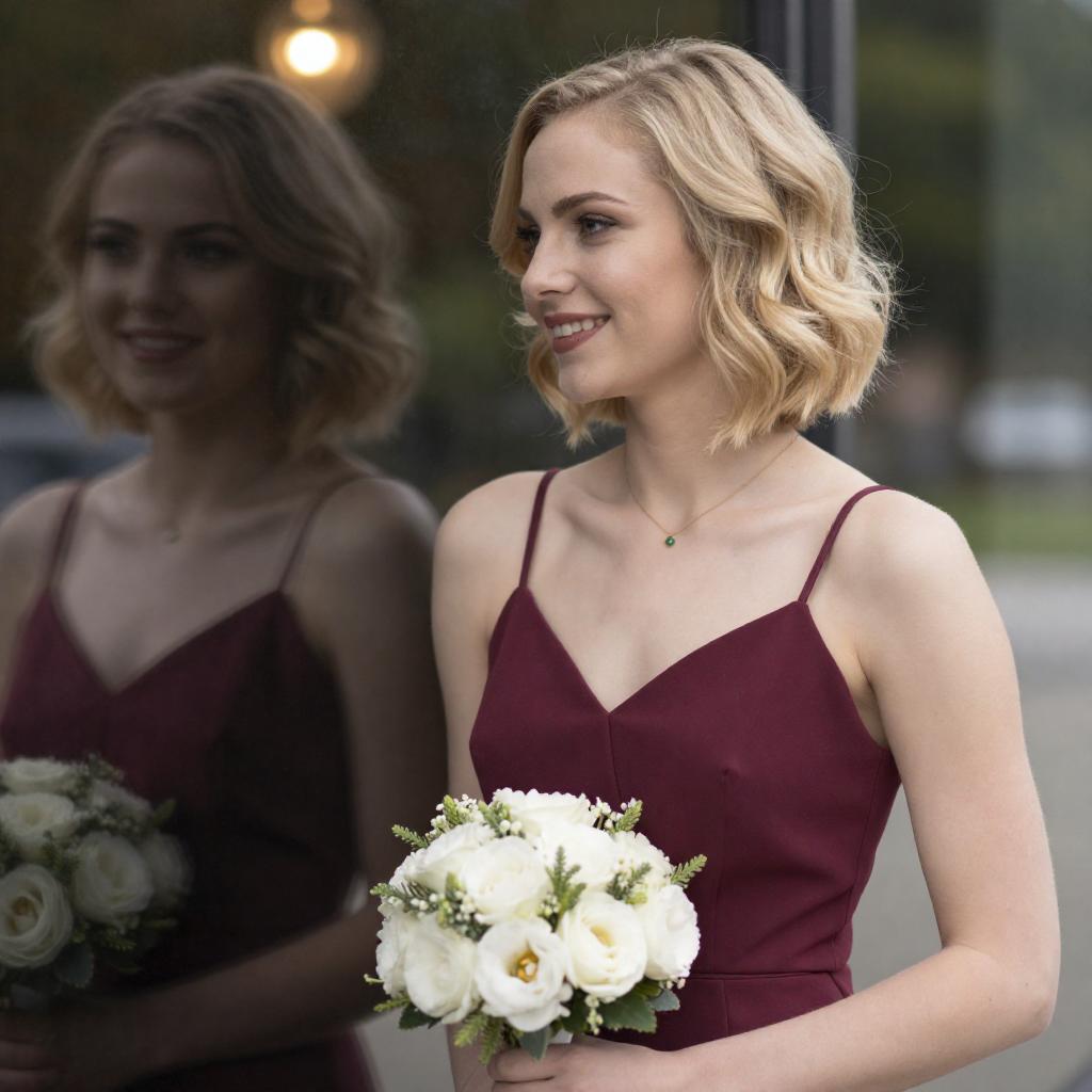 Photograph of two women. Blonde woman with bob haircut, maroon spaghetti strap dress, holding white flower bouquet, looking to the side, smiling. Dark-haired woman with curly hair, partially visible, reflection in window. Greenery and blurred lights in background.