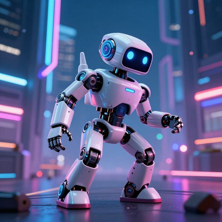 Photorealistic CGI of a white, humanoid robot with glowing blue eyes and neon accents standing in a futuristic cityscape. The robot has a sleek, shiny body with black joints and blue circular lights on its chest and shoulders. It stands on a glossy, dark street with blurred neon lights in pink, blue, and purple hues in the background, giving a cyberpunk vibe. The robot's arms are slightly bent, and it appears ready to move. The scene is brightly lit with vibrant colors and a high-tech atmosphere.