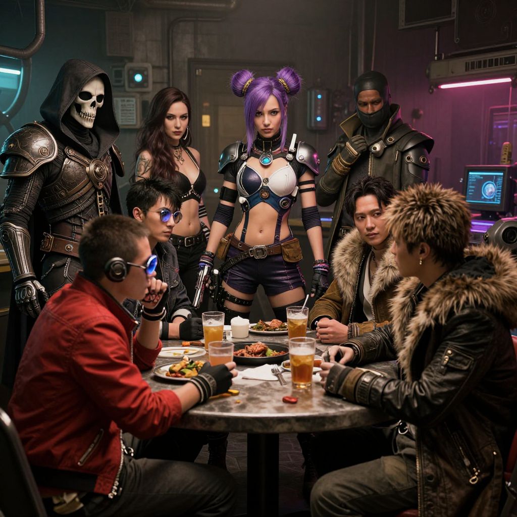In this vividly detailed cyberpunk scene, a group of six characters, each with distinct appearances and attire, are gathered around a table in a dimly lit, cluttered room. The central figure, a woman with purple hair styled in twin buns, stands out with her futuristic, armored outfit and a gun holstered at her side. To her left, a skeletal figure in a hooded cloak and mask stands guard, his armor adorned with intricate details. Next to him, a woman with long, flowing hair and a revealing top exudes a mysterious aura. Seated at the table, a person in a red jacket and goggles gazes intently, while another character, partially obscured, wears a fur hood and a rugged coat. The table is strewn with drinks and utensils, adding to the gritty atmosphere. The background is filled with various objects and machinery, contributing to the sense of a high-tech, dystopian world. The overall composition is dynamic, with characters positioned in a way that suggests a moment of anticipation or strategy, as if they are preparing for an imminent action.