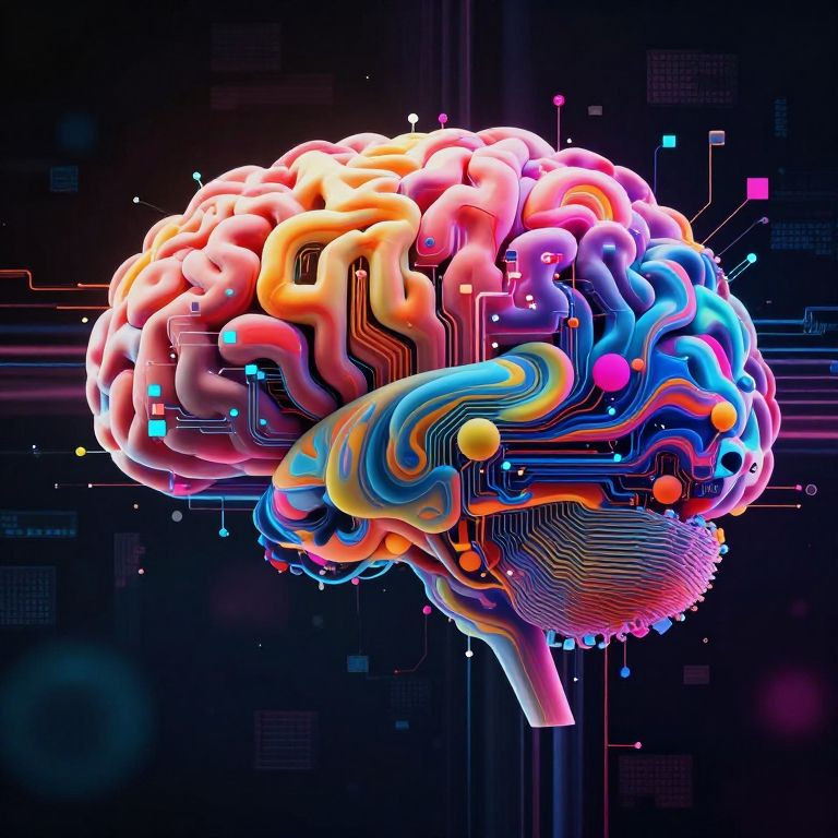 Digital art of a colorful, neon-lit human brain with swirling, multicolored patterns and circuit lines against a dark, tech-themed background.