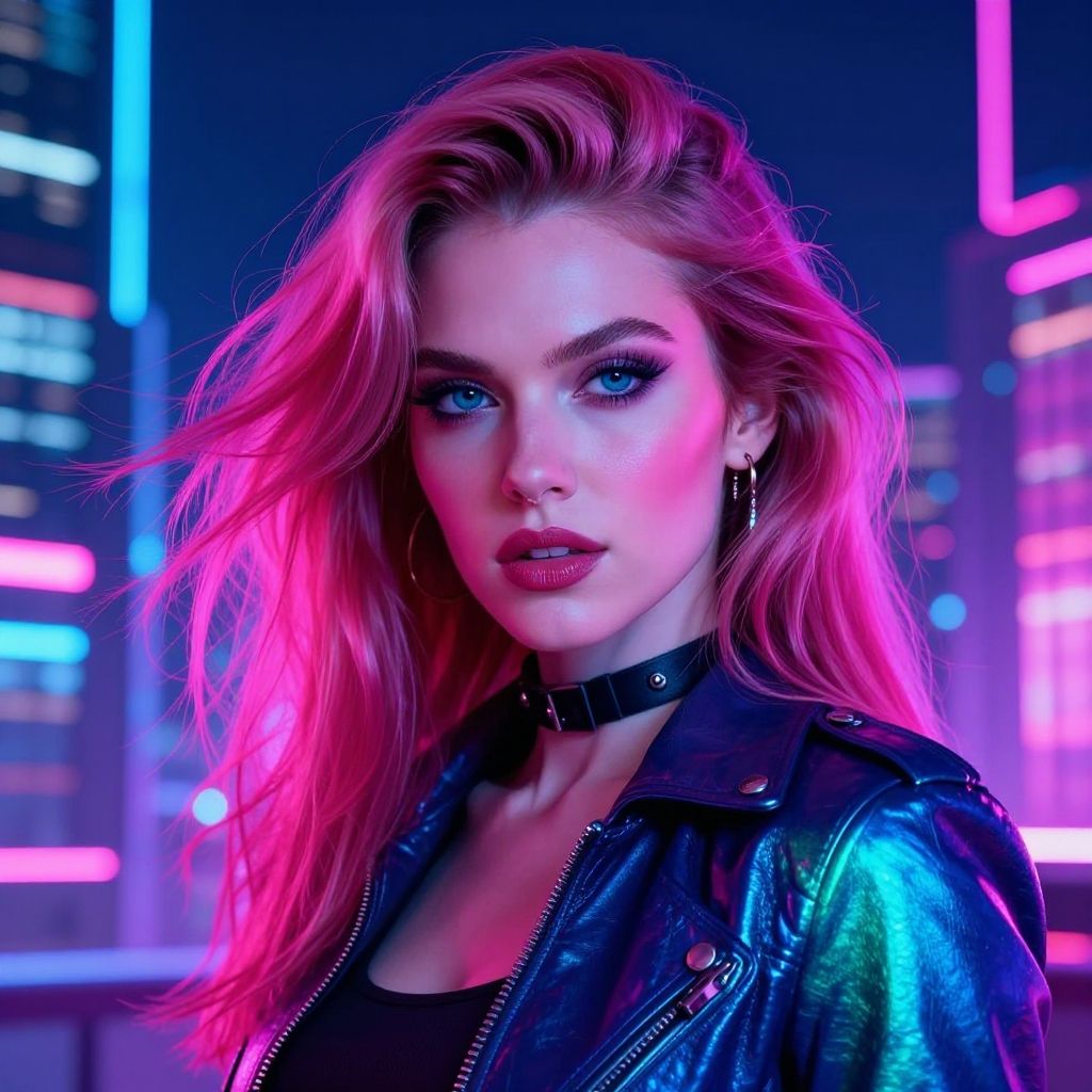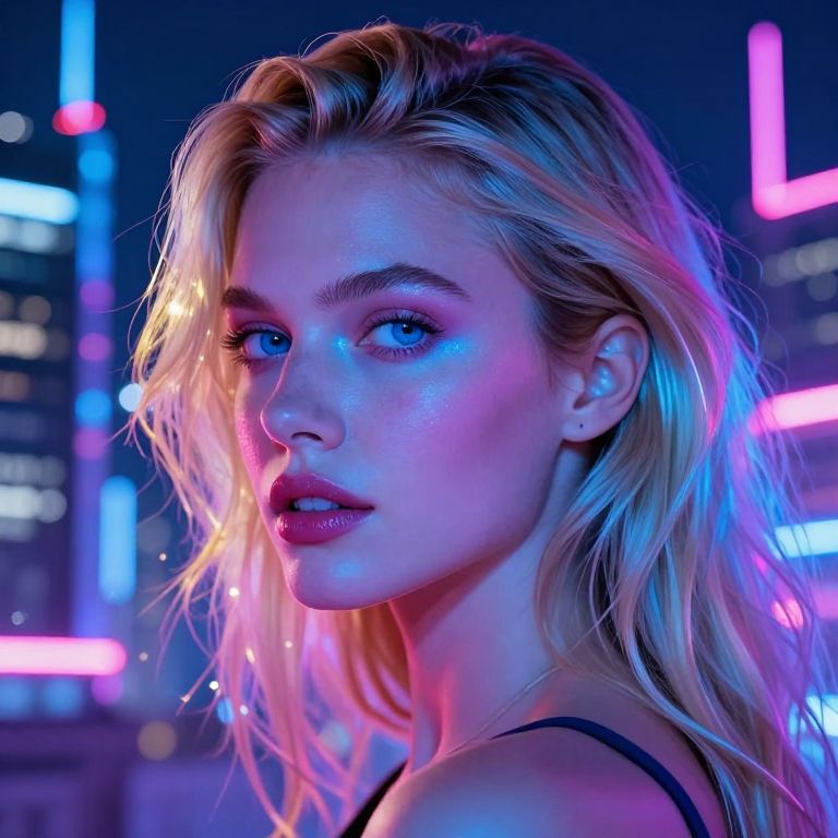 A stunning blonde female in a profile portrait, her sharp features highlighted by the neon glow around her, Her piercing blue eyes lock onto the viewer with an intense, Amazonian gaze, radiating confidence and power, The background is a futuristic cityscape at night, a blur of towering skyscrapers and glowing neon signs that blend into a kaleidoscope of colors, A neon color gradient overlays the scene, casting her face in hues of electric blues, purples, and pinks, Soft bokeh lights dance across the image, creating a dreamlike effect, while the light catches the delicate strands of her hair, making them shimmer like spun gold, The atmosphere is electric and surreal, the neon lights reflecting in her eyes, enhancing her allure with a vibrant, otherworldly beauty