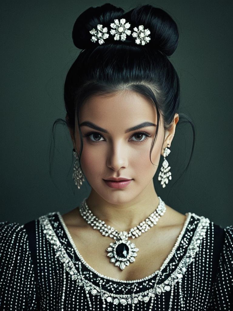Portrait of a young woman with black hair styled in an elegant bun adorned with flower-shaped hair ornaments. She is wearing a black dress embellished with silver or diamond-like beads and sequins, and matching jewelry including drop earrings and a statement necklace featuring a large black gemstone surrounded by smaller clear stones. The woman has a calm and confident expression, looking directly at the viewer.